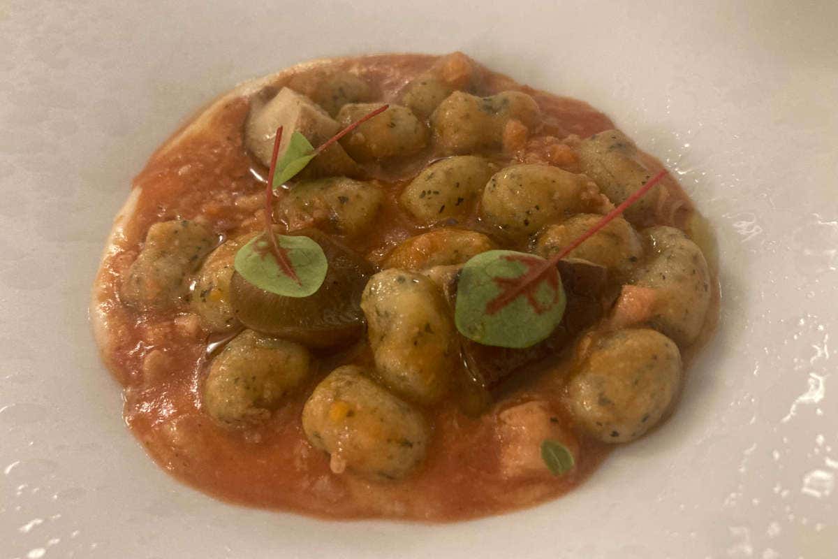 Gnocchi di cicoria, caprese liquida e ragù di coniglio