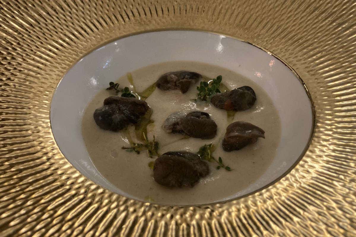 Ecco alcuni dei piatti dei due menu degustazione assaggiati. L'ostrica Gillardeau con mirepoix di mela Smith marinata all'anice, accompagnata da caviale di Beluga, offre una combinazione delicata di sapori intensificata dalla marinatura acida. Il flan di finocchietto dell’Etna con triglia di fango all’arancia, maya d'ostrica e tuille all'aglio nero, esalta il contrasto tra il pesce scottato e il vegetale stufato, arricchito da contorni di pesce e vegetali.