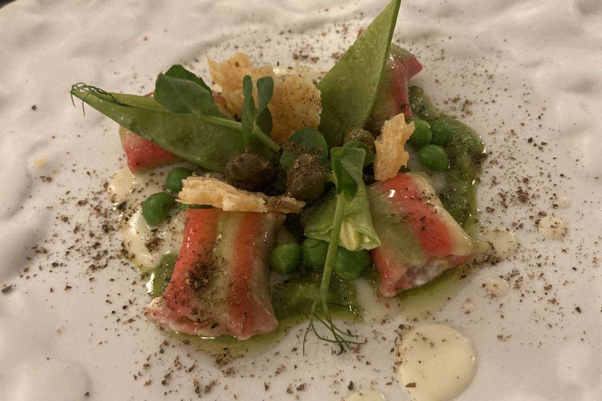 Il battuto di Wagyu con millefoglie di patate, maionese wasabi e miele di castagno, crea un equilibrio straordinario tra dolce, salato, amaro e acido, mentre i plin al formaggio di capra con vellutata di piselli, crema di Parmigiano Reggiano e polvere di capperi offrono un’armonia perfetta tra l’umami del formaggio e le delicate acidità vegetali. Il flan di verdure di stagione con fonduta di tumazzu e tuille all'aglio nero gioca con le acidità vegetali, interrotte dalla morbidezza del formaggio e dalla delicatezza dell'aglio nero. La quaglia ripiena all’arancia, con crumble salato, maya di Tarocco rosso, mirtilli e arachidi, è una magistrale esecuzione che combina in modo raffinato l'acidità della frutta con la succulenza della carne.