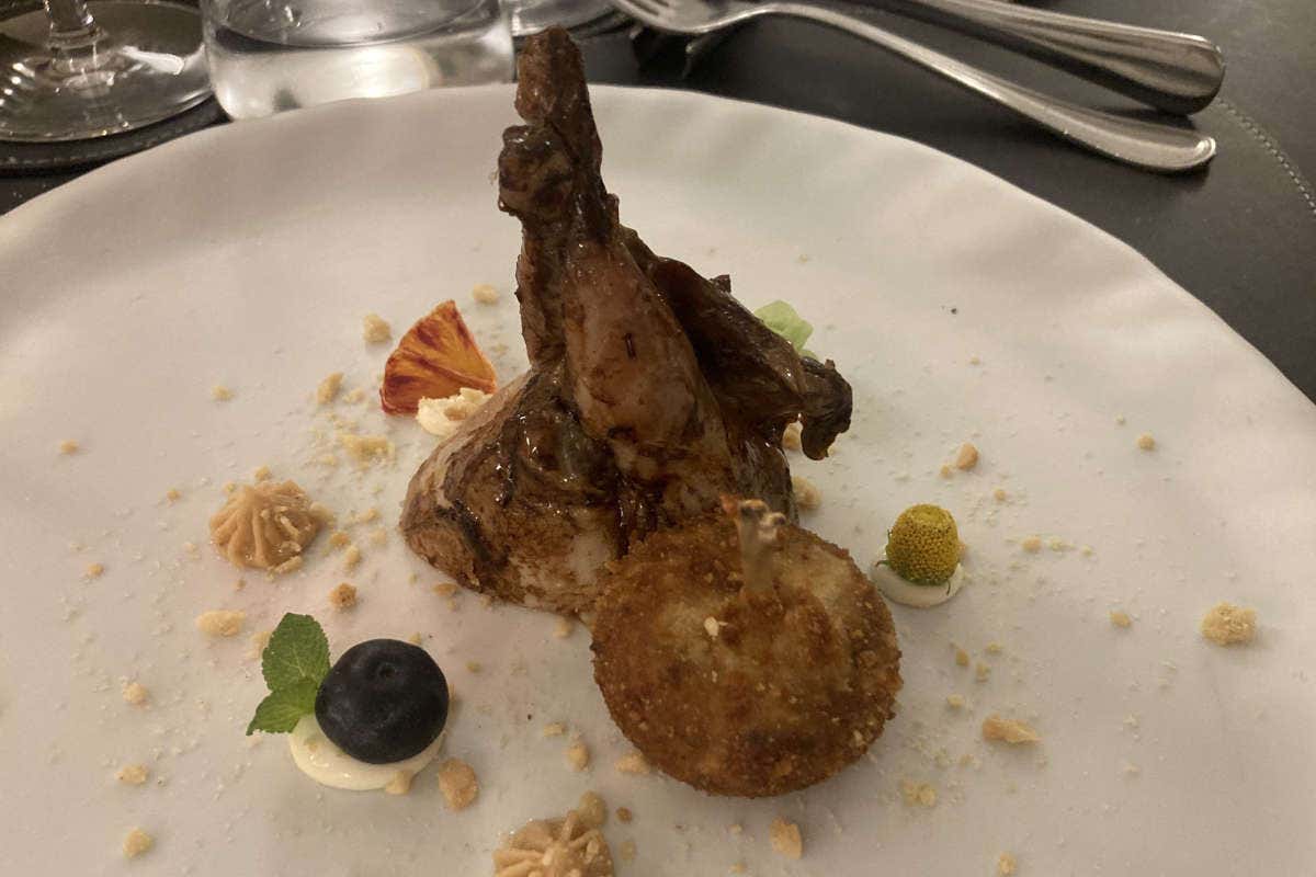 Quaglia ripiena all’arancia, crumble salato, maya di Tarocco rosso, mirtilli e arachidi