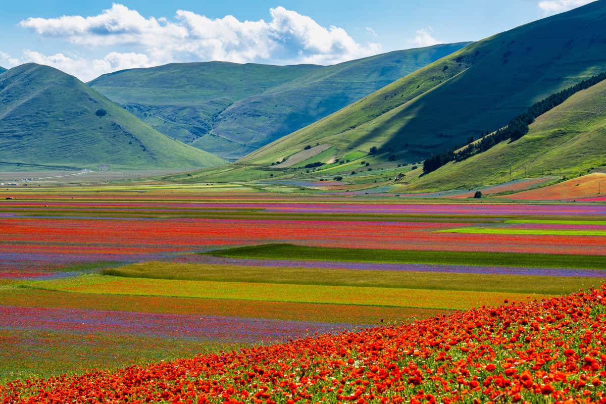 A Castelluccio di Norcia, nella splendida regione dell'Umbria, da metà maggio a metà luglio, Pian Grande si trasforma in un dipinto vivace e mozzafiato, dove il viola, il bianco, il verde, il turchese, il giallo e il rosso si mescolano in armonia. Qui, l'erba fresca verde si sposa con fiori come viole, papaveri rossi e i delicati fiori bianchi dalle sfumature viola delle lenticchie, insieme ad altre varietà che sbocciano spontaneamente, creando una tavolozza cromatica che emana gioia e vitalità.