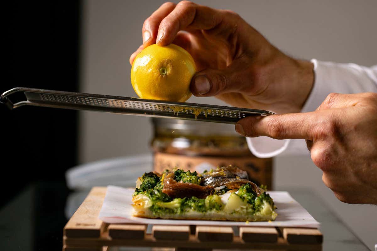 Alessandro però non si limita alle diverse tecniche di cottura, ma si dedica alle preparazioni di ogni pesto, olio aromatizzato e dressing. Come per la sua versione di margherita con base rossa e in uscita al bancone fiordilatte di Manduria a crudo, pesto trapanese (pomodorini semi dry, pomodorini freschi, mandorle tostate, basilico, prezzemolo e olio extra vergine di oliva) e clorofilla di basilico. O per la pancetta e tomino con dressing al miele (miele, succo di limone, olio e pepe tostato); o ancora per la pizza con le patate servita al banco con un pesto di sedano (foglie di sedano sbollentate, mandorle tostate, alici, salsa all'uovo acida, prezzemolo, foglie di spinacio, succo di limone e la sua scorza, sale e olio).