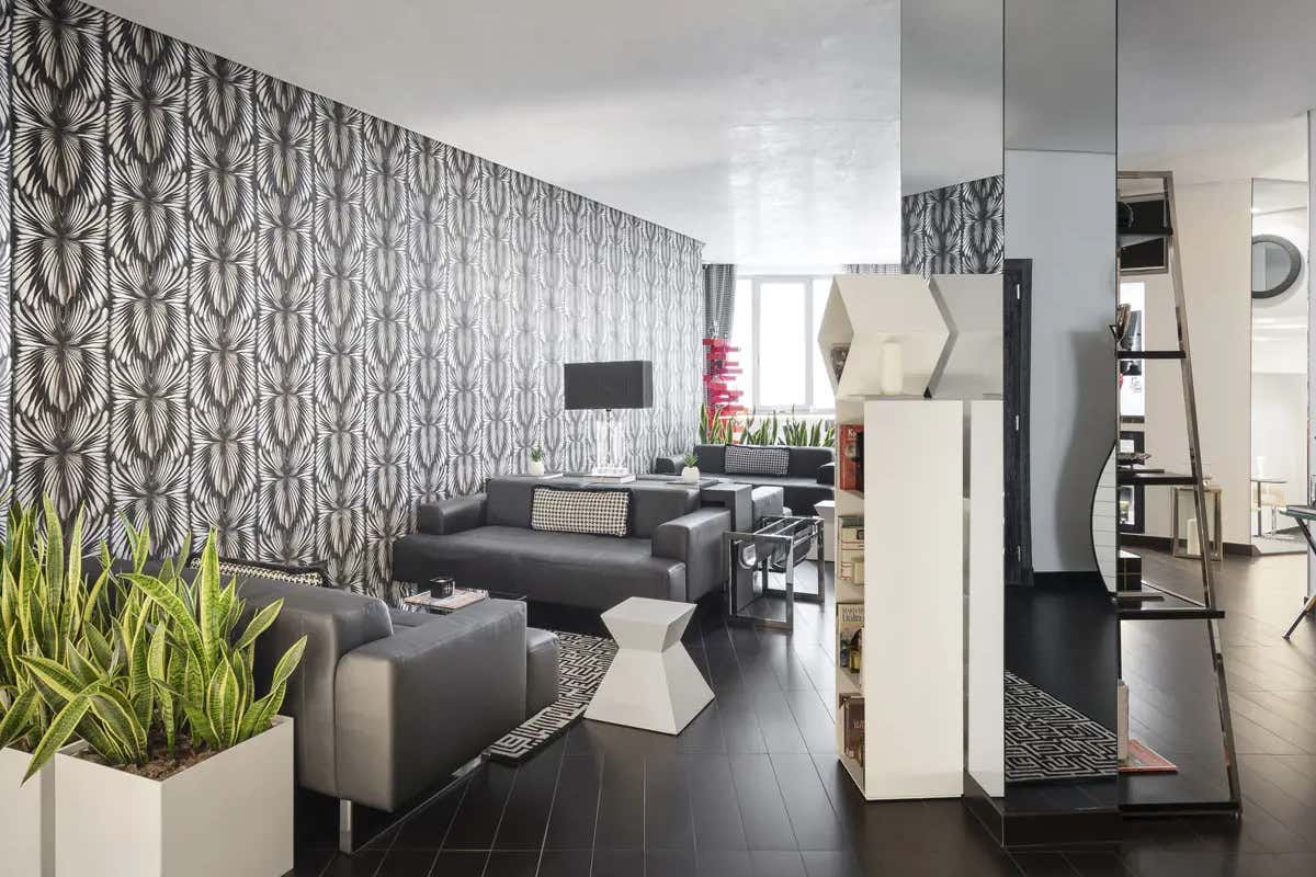 Si entra in una lobby raccolta, dominata dal quadrante di un grande orologio che fa da opera d’arte alla parete. Da lì si passa a una serie di salette molto colorate con divani, sedie, poltrone, poltroncine e tanti libri, perché questi appunto sono diventati oggetto di arredo, oltre che essere a disposizione per le letture degli ospiti: lo stile del designer d’arredi è molto evidente e dà all’albergo un tono che si ritrova poi ai piani. In una delle salette si trova anche il bar.