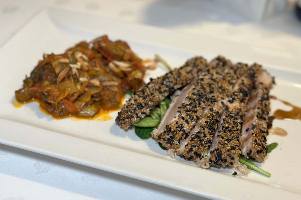 Tagliata di pesce spada al sesamo con caponata di carciofi della Locanda dell‘Angelo
