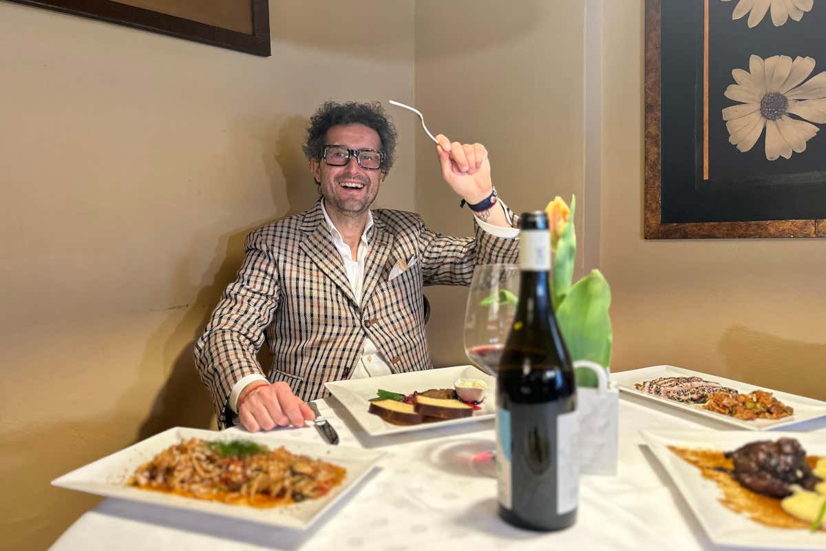 Federico Minghi assaggia le tagliatelle di pasta fresca cacio pepe e gamberi del ristorante dell'hotel Villa Cheli