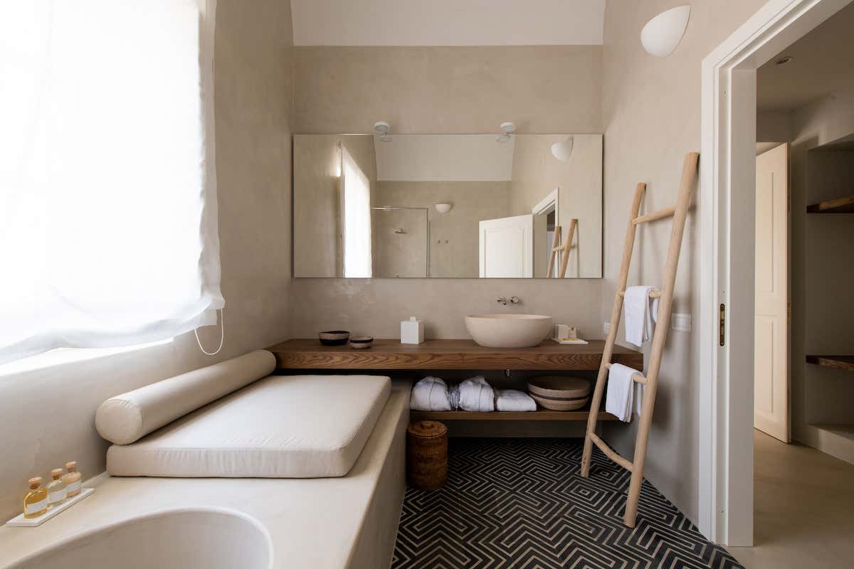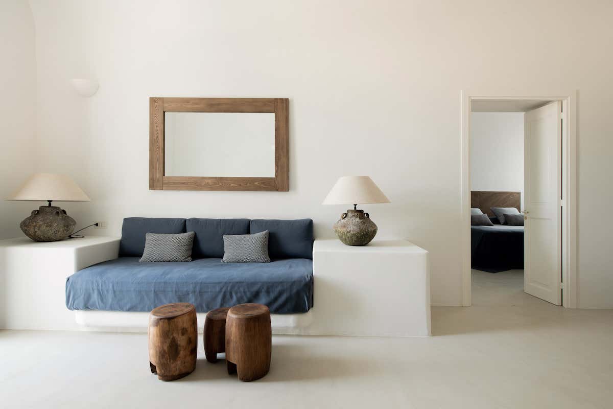 Gli interni sono caratterizzati da una palette cromatica che richiama la natura circostante: toni caldi e rassicuranti della terra, come il marrone, il sabbia, il bianco e il beige, sono accostati a tocchi di blu del mare. Pavimenti in micro-cemento, pareti in calce bianca, arredi in muratura e in legno, lavabi in pietra calcarea, cementine artigianali nei bagni realizzate manualmente da una storica azienda di Santa Flavia su disegno degli architetti: sono tutti elementi che definiscono un concetto di lusso colto, non artefatto. «Trovandoci davanti a una natura così potente e a un luogo così ricco di suggestioni, negli interni abbiamo agito seguendo una poetica della sottrazione: abbiamo disegnato ogni dettaglio, con grande cura ma senza aggiungere orpelli, per definire in ogni ambiente un'eleganza e un'essenzialità che restituisse l'idea di un lusso raffinato e sobrio: quello del tempo che passa lento, nella bellezza delle cose semplici», spiega l'architetto Floriana Marotta.