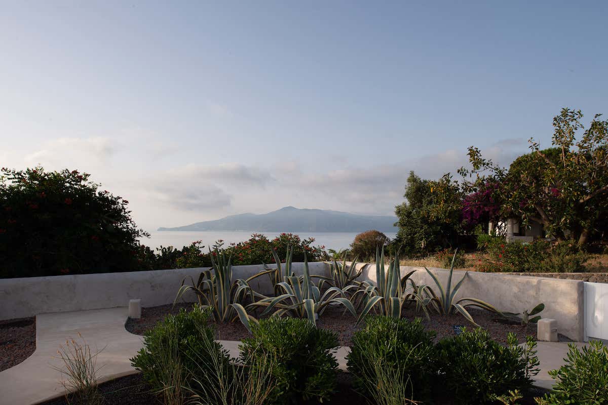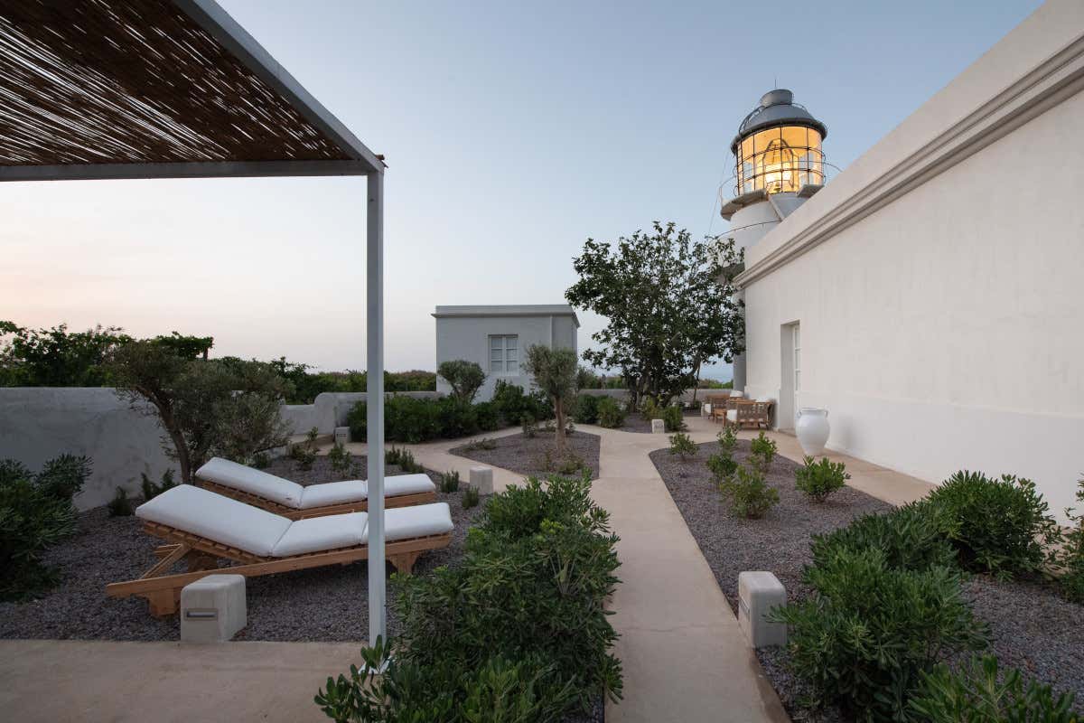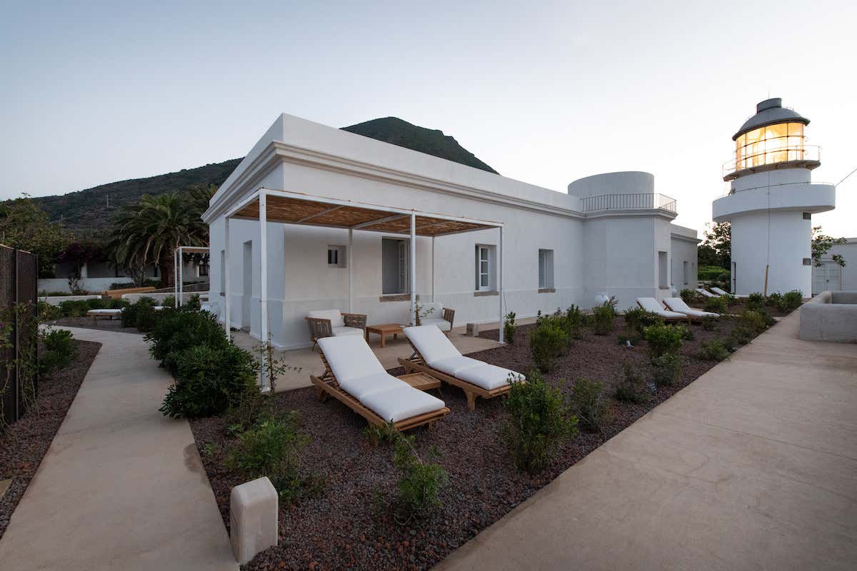 Gli architetti Floriana Marotta e Massimo Basile hanno lavorato anche sull'area paesaggistica di pertinenza del faro, e scegliendo di valorizzare il genius loci hanno attinto alla ricchezza dell'isola, dando forma a muretti a secco, vialetti in brecciolino vulcanico locale, cannicciati sorretti da esili strutture che ombreggiano con discrezione i giardini privati delle suite.