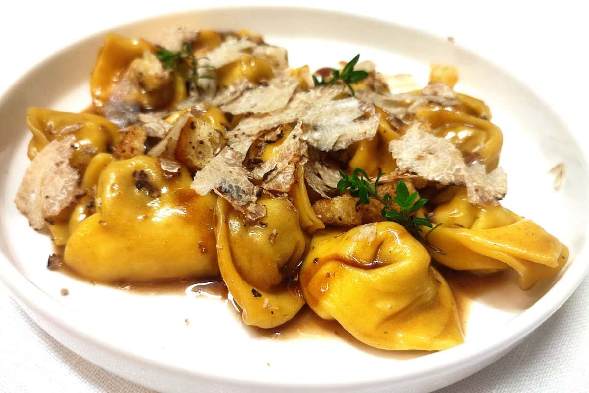 Cappellacci con carni bianche brasate, demi-glace di vitello e tartufo bianchetto