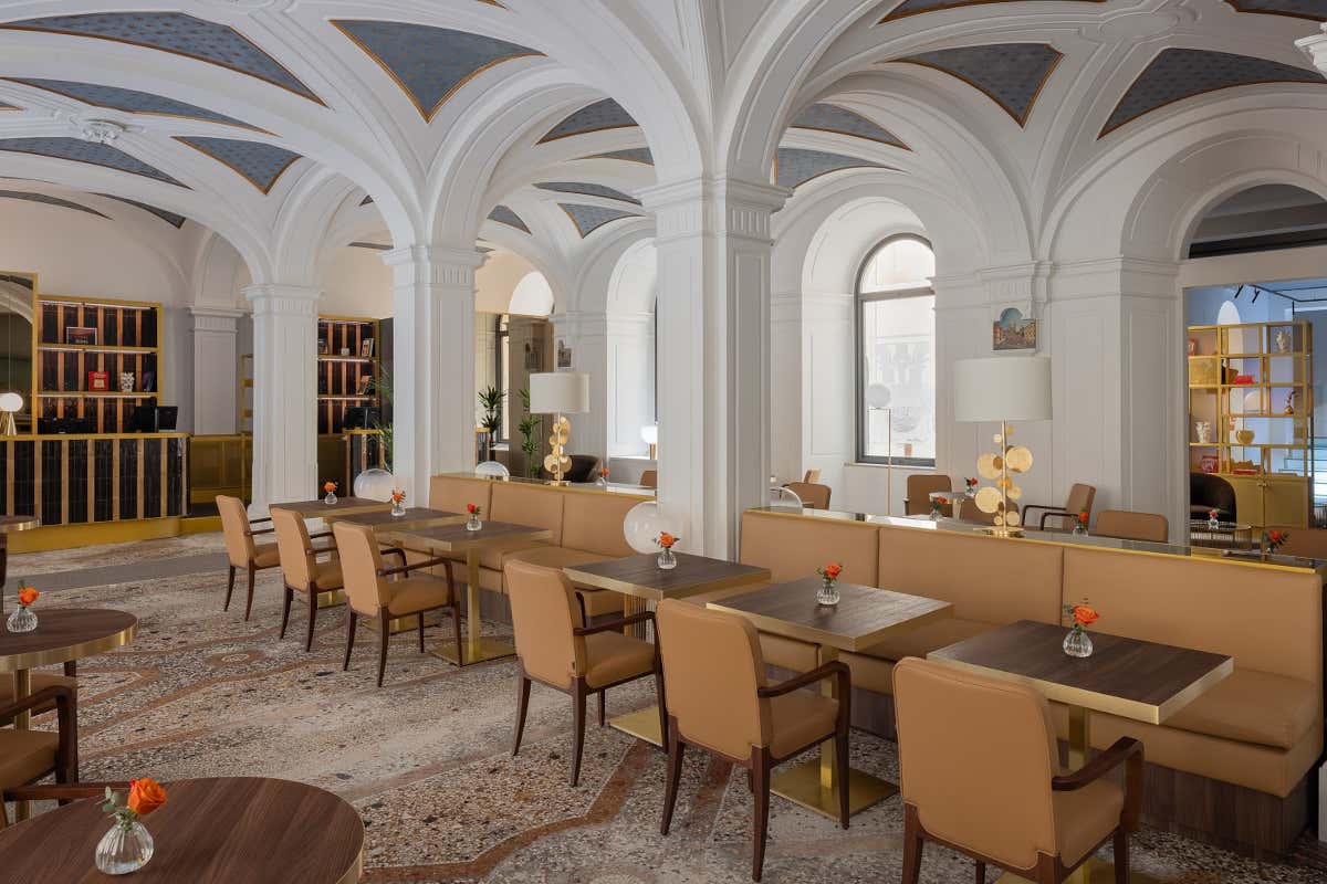 Gli arredi e il design armonizzano elementi strutturali storici e moderni con specchiere, marmi policromi, elementi in ottone e in ceramica esaltando la il grande spazio della hall, antica cappella della chiesa ottocentesca appartenuta alla congregazione religiosa dei Fratelli delle Scuole Cristiane.