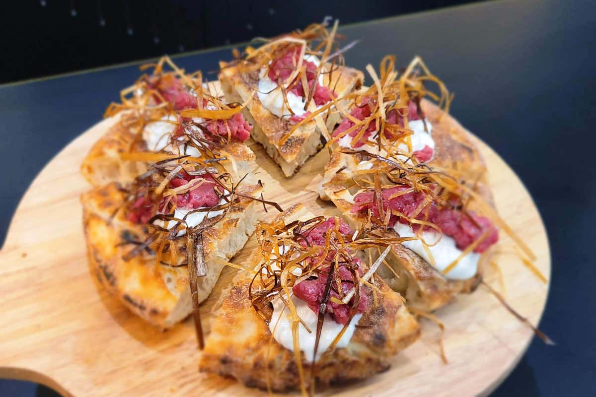 La degustazione Rinascita contempla altre ghiotte portate. Si comincia con l’Arancino di Sorrento, fascinoso sin dall’olfatto: Riso Acquerello, grattugiata di zeste di Limone di Sorrento Igp, riduzione di basilico e pomodorino confit. L’Arancino è ben servito su una fonduta di Parmigiano Reggiano Dop. Altra testimonianza della forte inclusione del territorio è la portata successiva: Padellino bufalotto, consistente in Tartare di bufalotto, stracciata di bufala campana e porro fritto. Fino allo scorso secolo era davvero grama la vita del vitellino maschio della bufala. Più che grama, diremmo tragicamente brevissima: poche ore e poi lasciato annegare. Adesso, invece, i vitellini maschi vengono lasciati in vita almeno un anno: buone e ad alto valore nutritivo le loro carni. È il momento atteso della Margherita Rinascita, di cui si è detto. Ad essa successiva, altra pizza molto saporita: ‘A Friariella. Qui si avverte particolarmente l’abilità di Antonio anche come cuoco e non solo come pizzaiolo. I friarielli sono cotti in doppia consistenza, la Mozzarella di Bufala è quella affumicata altrimenti denominata provola, la salsiccia è da maiale nero casertano.