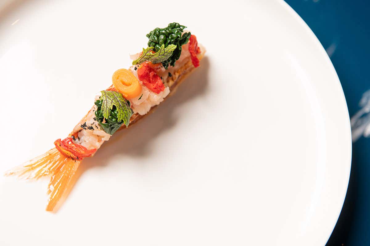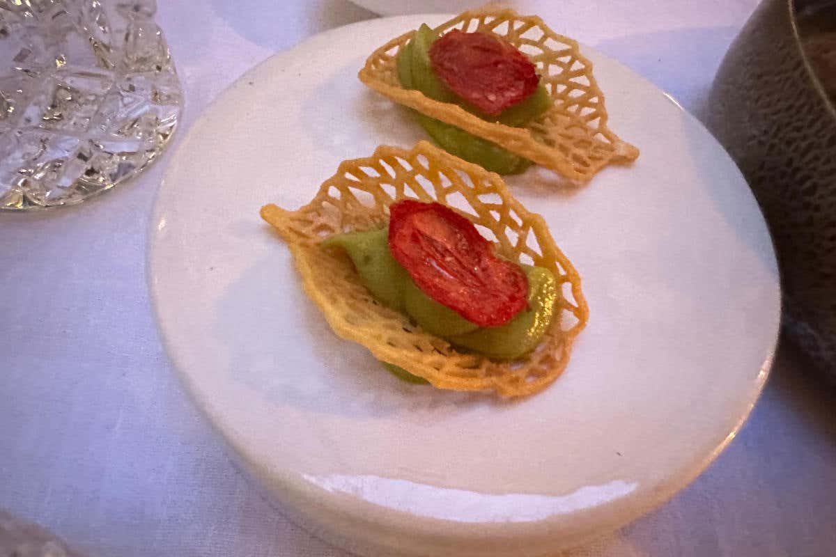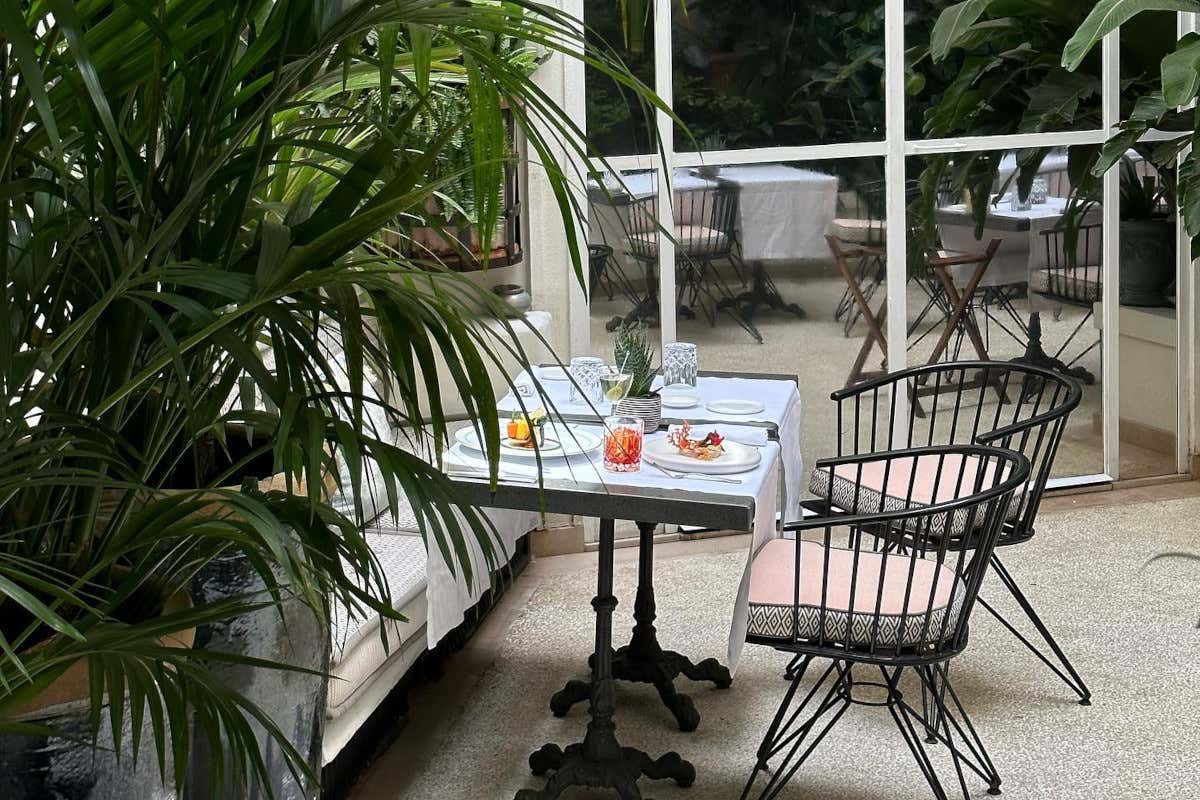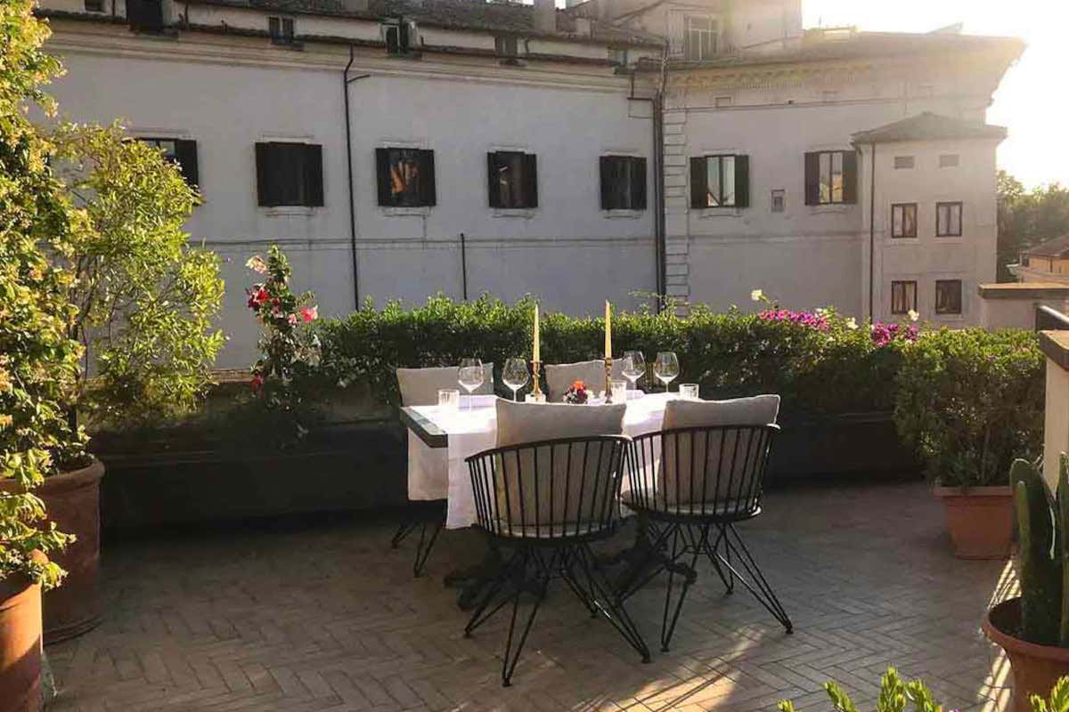 Fra rampicanti di gelsomini profumati e bouganville e si gode di una vista privilegiata sul giardino segreto di Palazzo Borghese, tra fontane zampillanti e mascheroni rinascimentali. Guardando oltre, la vista spazia fino al Tevere, i tetti si inseguono e Roma sembra ancora più onirica da quassù, del tutto inedita e sotto voce, per quanto segretamente sontuosa. Un ambiente che è una sorta di speciale chef’s table dove vivere l’esperienza di un menu degustazione. I piatti di Gabriele Muro sono composti al tavolo, tra il profumo dei gelsomini e cascate di bouganville.