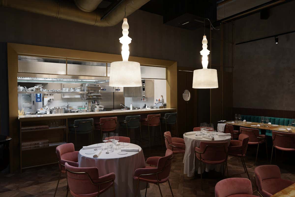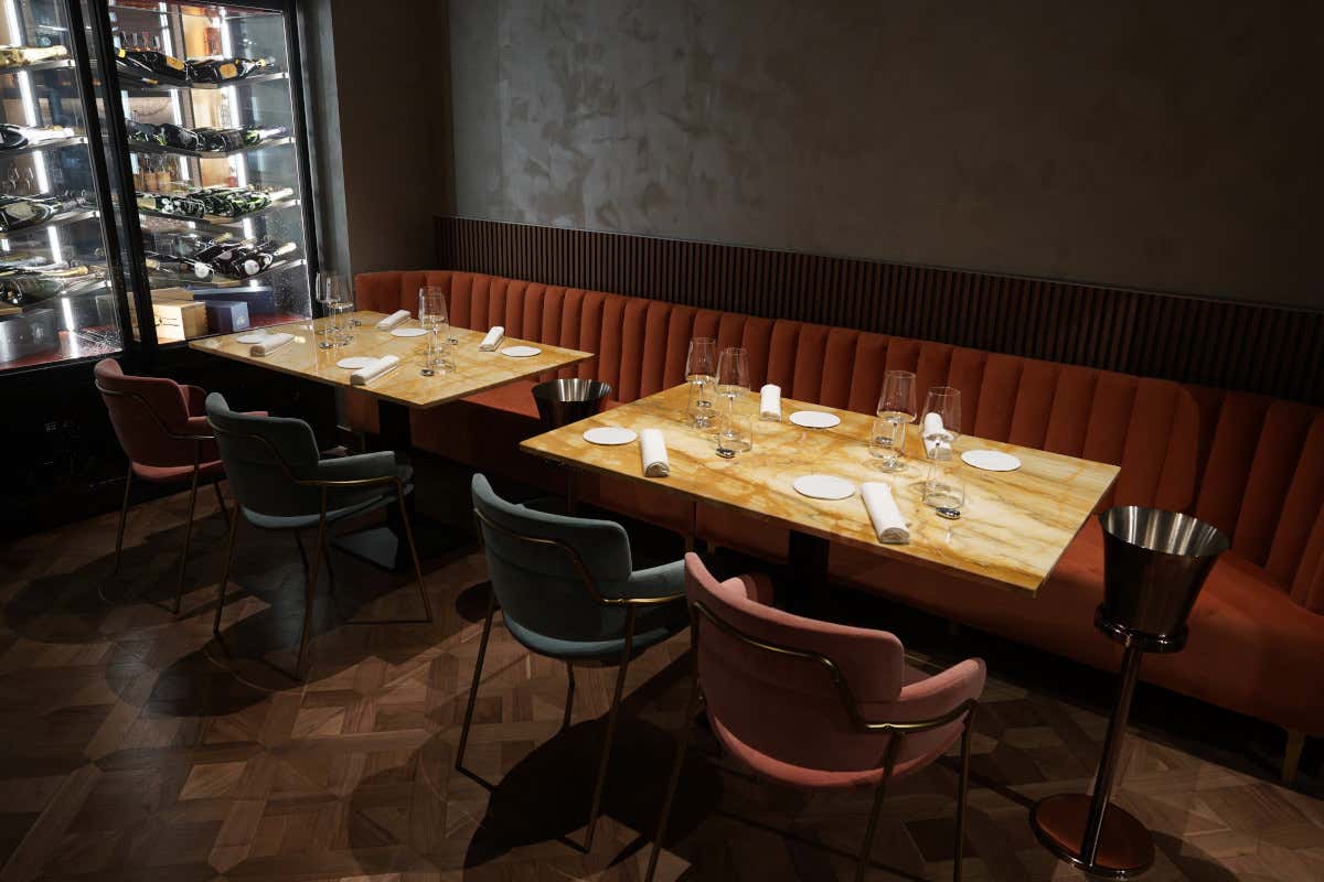 Si va dalle laccature color pavone al marmo breccia di Capraia, dagli ottoni bruniti ai pavimenti in legno e cassettoni. Le pareti sono rivestite in juta e i tavoli sono stati realizzati con piano in vetro opaco verniciato. Il lighting è curato con luci riflesse per creare penombre ed esaltare le forme degli oggetti. Spicca la cucina a vista e lo chef’s table in marmo con sgabelli in velluto. Strutture in ottone acidato brunito retroilluminate accolgono l’esposizione delle bottiglie di vini per una cantina a vista che cattura lo sguardo degli ospiti. E ancora: la “chicca”, più unica che rara a Milano, di un pianoforte a coda suonato dolcemente ogni sera per un sottofondo dolce quanto raffinato.