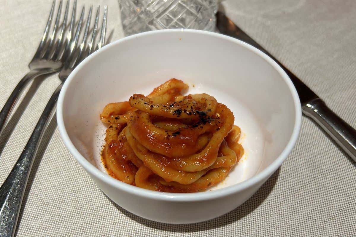Ricetta tipica del confine umbro-toscano è quella dei pici all’aglione (particolare tipologia di aglio tipico della Val di Chiana) insaporiti con un delicato e delizioso tocco di liquirizia. Si torna poi a Viterbo con il secondo: coniglio leprino con estratto di peperoni e una purea alla base. Tutto ciò basterebbe per uscire da Trevinano pieni e felici, ma è il momento del dolce quello in cui Iside cala il proprio jolly. Lei, che i primi passi in cucina li ha mossi come pasticcera, propone una deliziosa ricotta con visciole e miele prima di uno dei suoi marchi di fabbrica: la propria interpretazione dell’Italia secondo i dolci tipici (per ovvie ragioni, in formato mignon) dello Stivale.