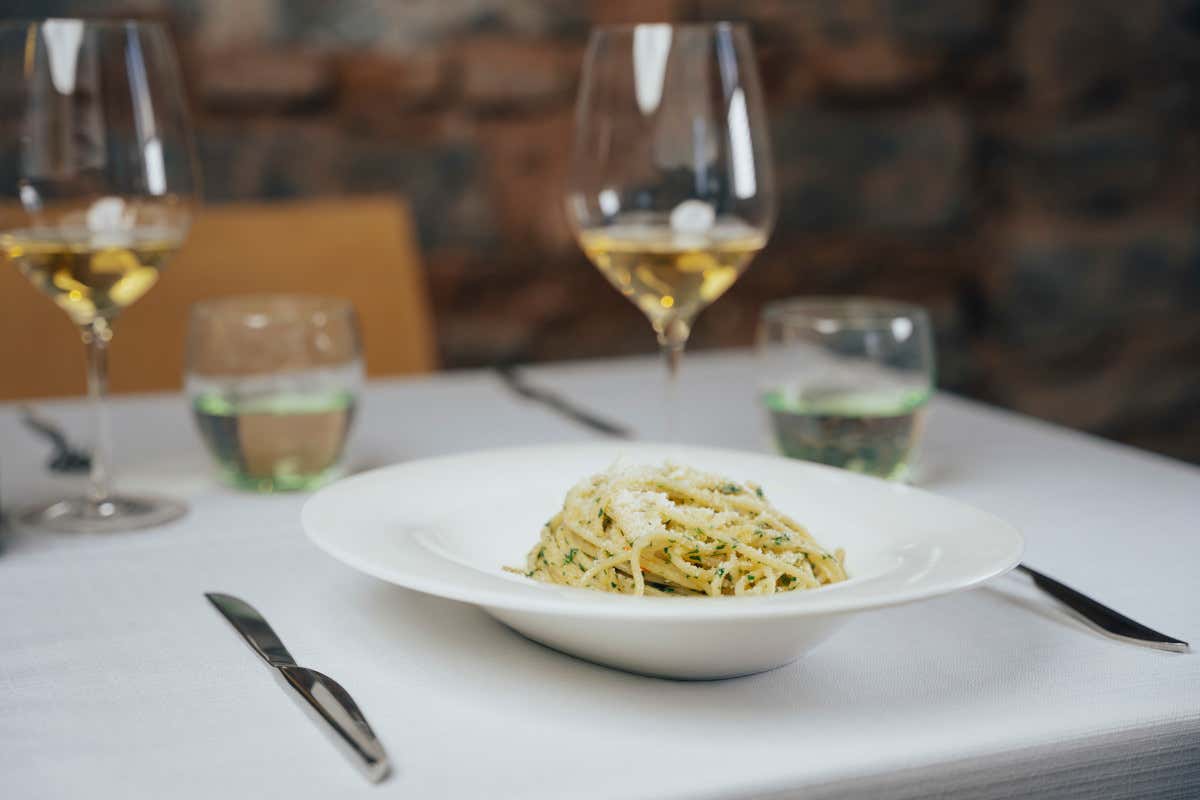Poi per primo delle bavette ai ricci di mare, alle quali era possibile aggiungere la ricotta, che si è rivelata solo una aggiunta grassa da evitare per ottenere un gusto più netto. E come altro primo, è stato scelto un altro degli antipasti: una insalata di stocco con sedano, olive e capperi, la cui intensità del suo gusto sapido colma il sapore umami del pesce secco reidratato.