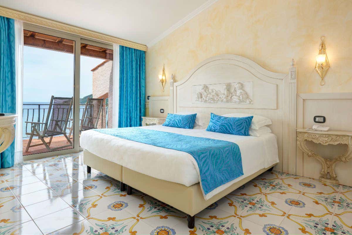 Le camere, arredate con eleganza e comfort, sono dotate di balconi o terrazze con vista panoramica sul mare o sui giardini. Gli ospiti possono godere di una spiaggia privata attrezzata, piscine all'aperto, campi da tennis, e un campo da golf. L'hotel dispone anche di un centro benessere con trattamenti personalizzati, sauna e bagno turco, per un'esperienza di totale relax.
