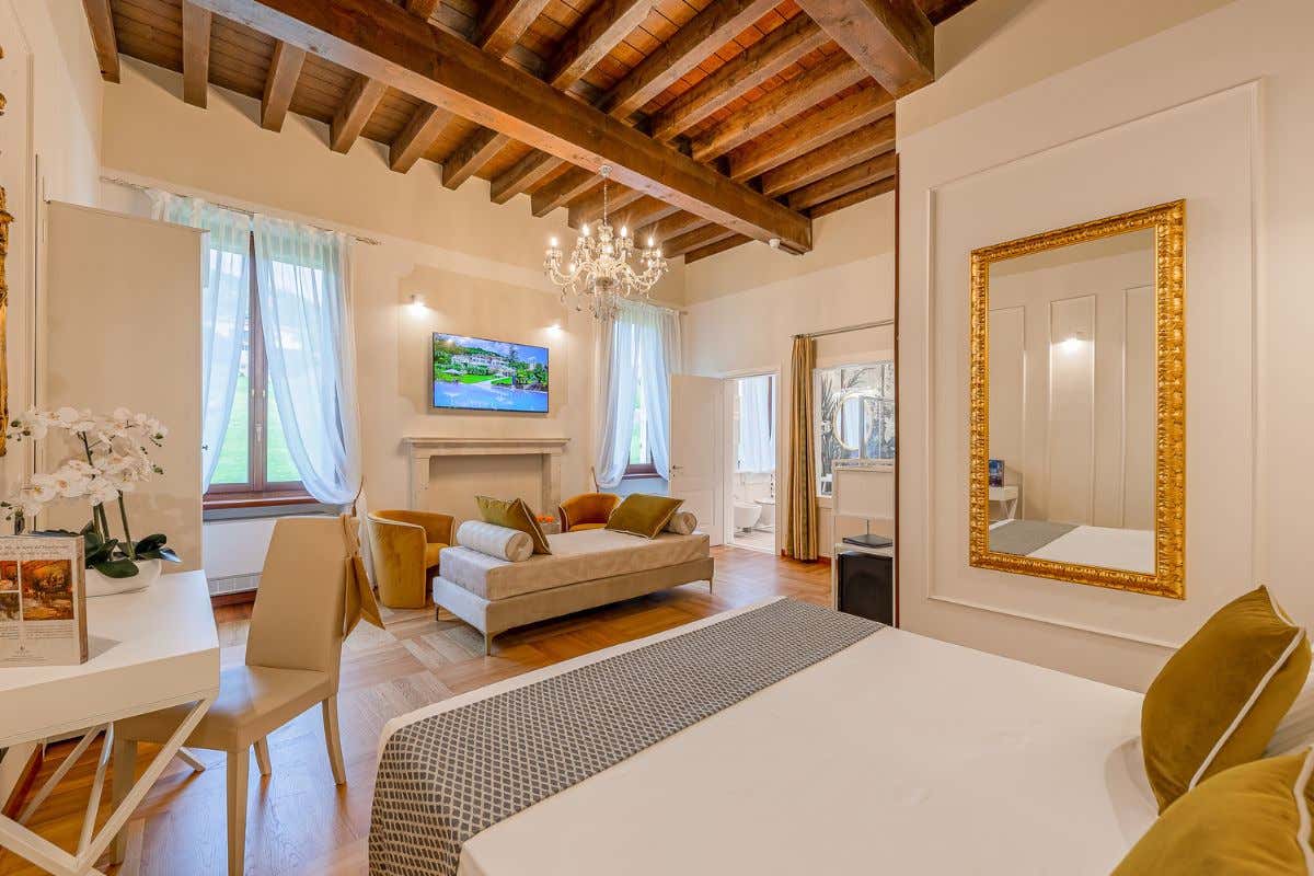 L’elegante hotel 4 stelle sorge all’interno di una villa veneta del XV secolo e mette a disposizione degli ospiti 36 camere che si affacciano sui rigogliosi parchi che circondano la struttura. Gli ospiti dell’hotel possono soggiornare in camere eleganti e suite esclusive, dove l’essenza autentica delle affascinanti ville venete e lo stile raffinato dei moderni concept di design si combinano armoniosamente. Una proposta unica, che fonde comfort e charme e garantisce un’esperienza davvero indimenticabile. Ogni camera risponde a tutte le necessità dei suoi ospiti, grazie ai numerosi servizi di cui è dotata: Wi-fi, telefono, cassaforte, bagno privato con bidet e phon, tv con canali satellitari e smart Tv, minibar, riscaldamento e Aria Condizionata, scrivania e armadio. Il pernottamento include anche la colazione – durante l’estate servita sulla splendida terrazza del nostro ristorante – con un ricco buffet di prelibatezze dolci e salate.