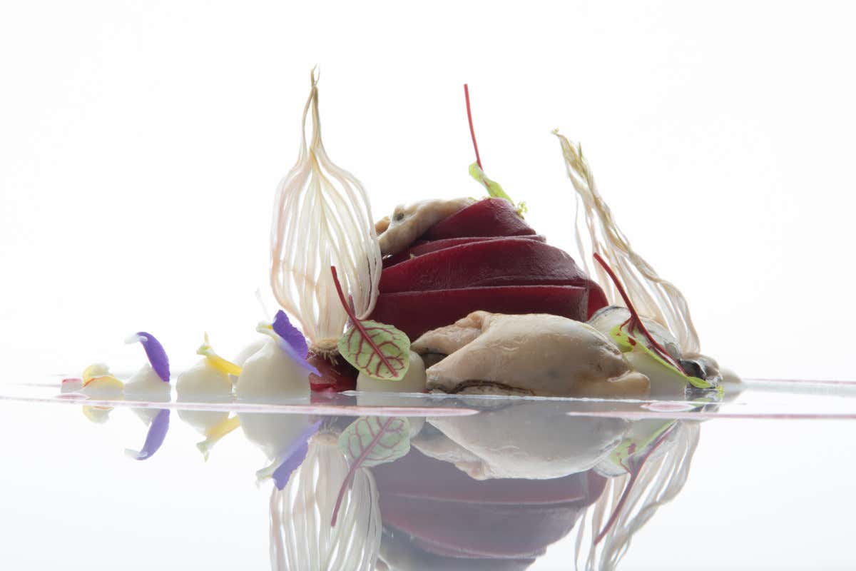 E con i primi… credevamo di avere finito. E invece no! Se è vero che due è meglio di uno, quando in cucina c’è un certo Luigi Tramontano ed in sala c’è una certa Nicoletta Gargiulo, allora diventa vero anche che tre è meglio di due. Insomma, a farla breve, sorpresa: fettuccia barbabietole e ostrica! La fettuccia di Gragnano Igp termina la sua cottura in estratto di barbabietola con cipollotto fresco. Con sapienza e con perfetto timing, lo chef aggiunge le ostriche e, a completamento, una discreta grattugiata di lime. Che bontà. Nicoletta sommelier, servizio impeccabile e competenza augusta, ci versa nei calici in abbinamento il Pinot Grigio Ramato fatto da Antonutti.
