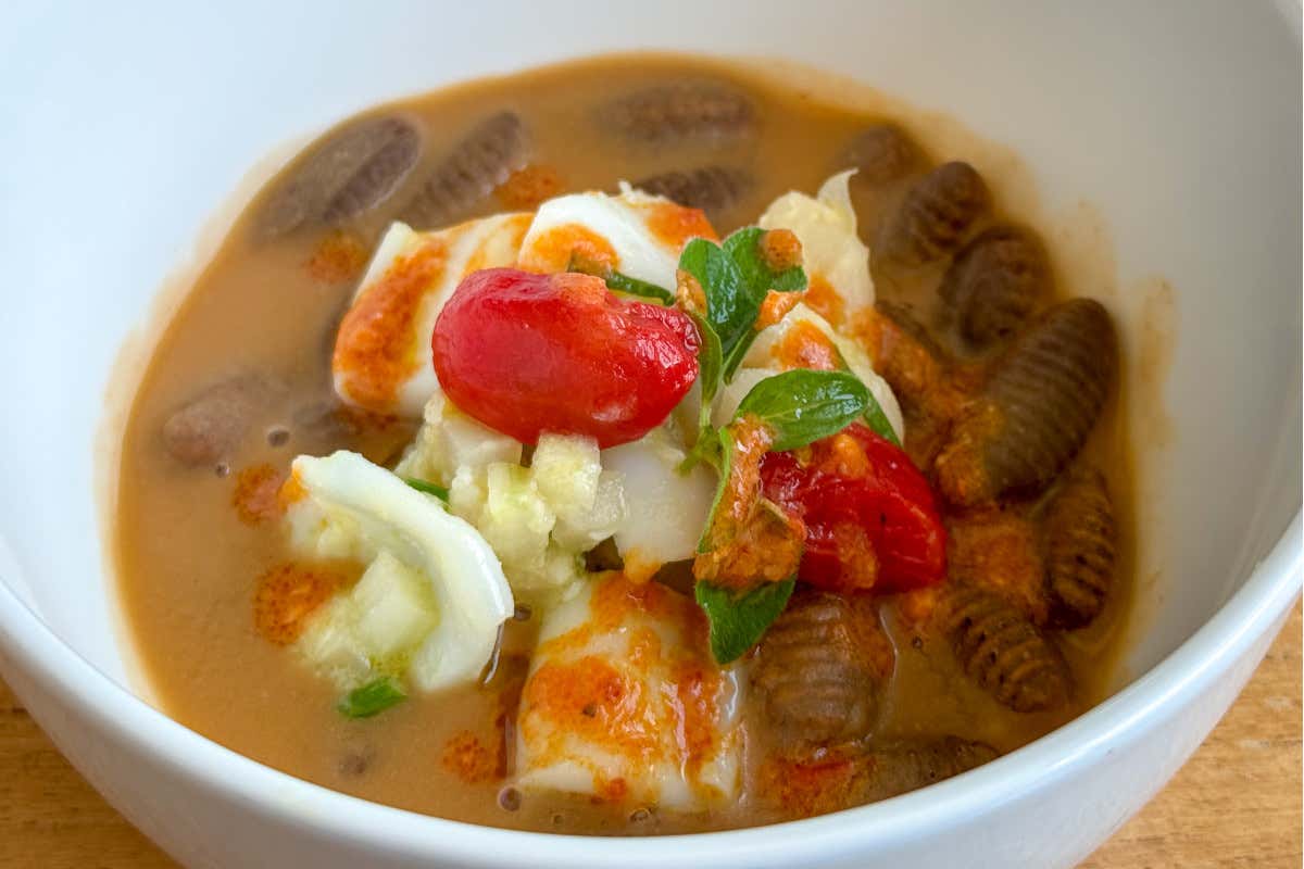 Cavatelli di grano arso, fagioli, seppia, pomodori confit, nduja di Villa Làrio
