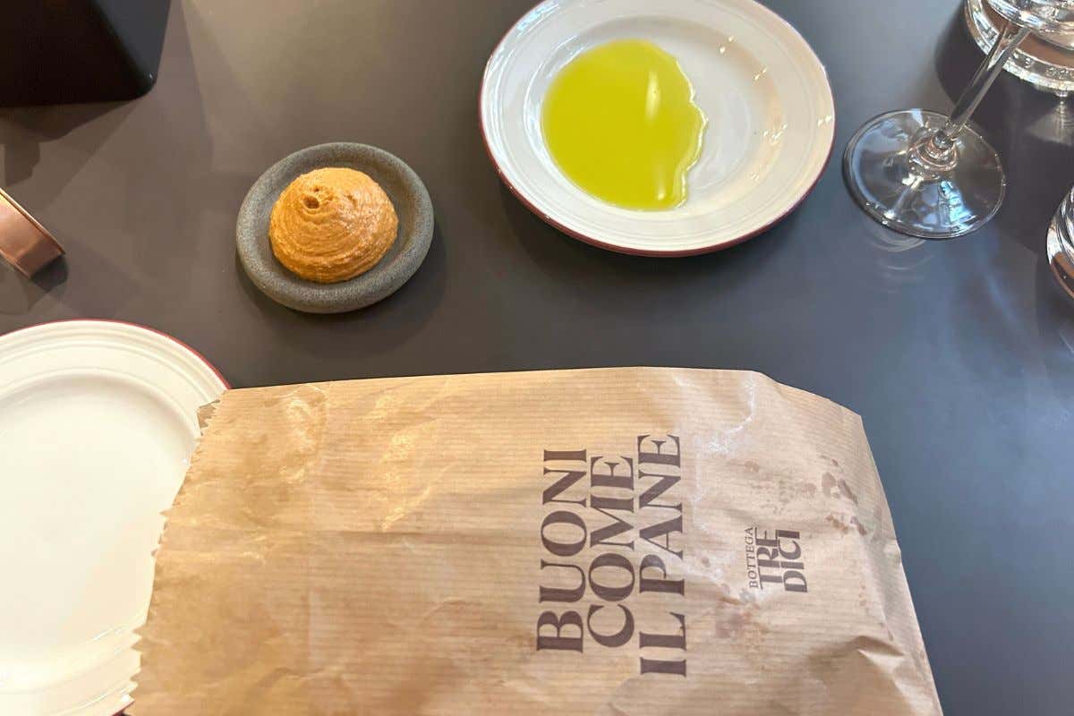Il pane e olio di Bottega Tredici, salsina al pomodoro, taggiasche e mandorle