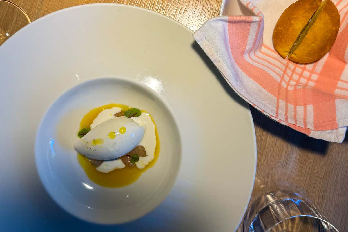 La tartare di gambero rosso è la componente proteica, cruda e delicata, mentre il succo di mandarino chiude il cerchio con la freschezza agrumata. L'interazione tra cucchiaio e maritozzo crea un gioco tra consistenze e sapori e porta il palato in uno scambio continuo tra dolcezza e sapidità. È un piatto che richiede attenzione e partecipazione.