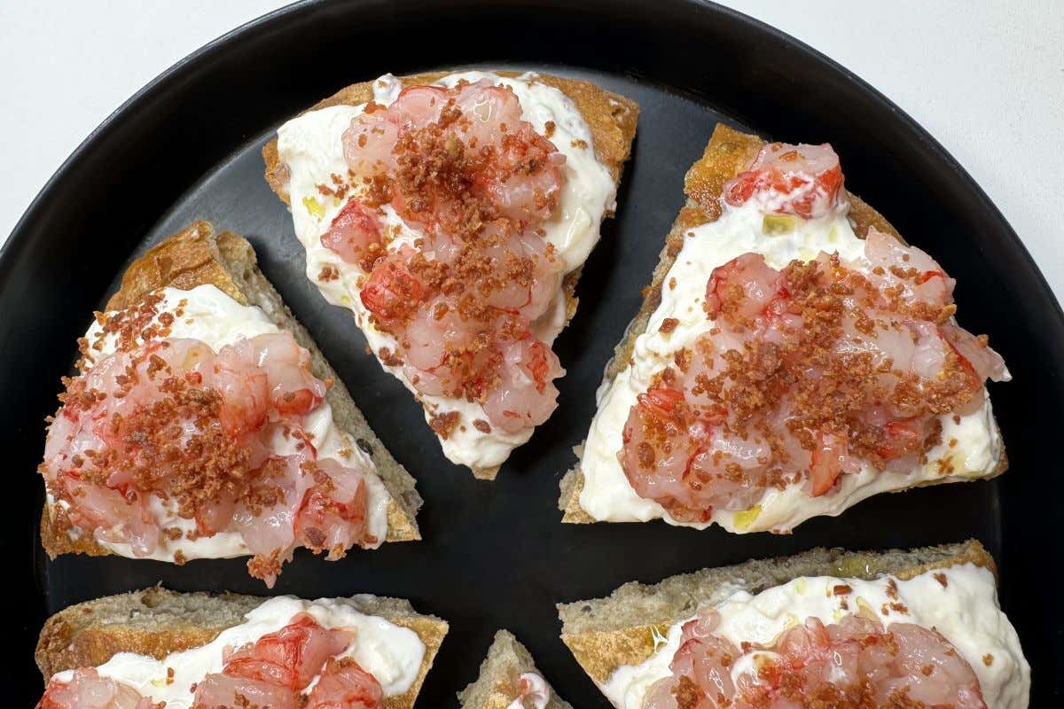 La Mari e Monti, con battuta di gamberi, colatura di alici e prosciutto di Norcia