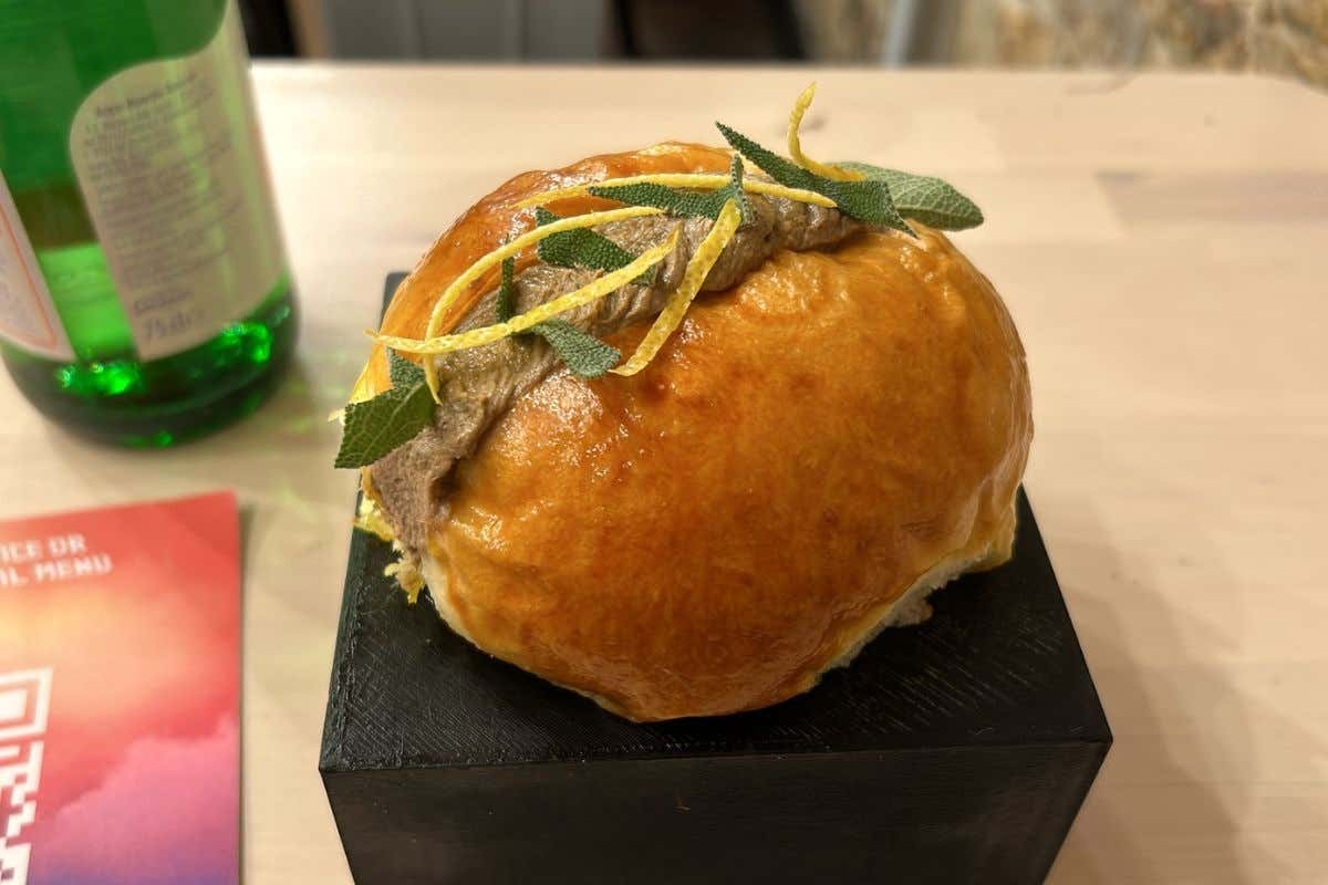 Quindi cosa si mangia, oggi, da Da Andrea Pizza Contemporanea? Un menu che si divide tra pizze contemporanee, romane, al padellino, in più una bella scelta di maritozzi salati per aprire il pasto. Nello specifico, abbiamo assaggiato quello che si lega più all’Umbria, con un paté di fegatini di pollo come farcitura, il tutto puntellato con scorza di limone e salvia a conferire una piacevole nota fresca che “smorza” il sapore del fegato.
