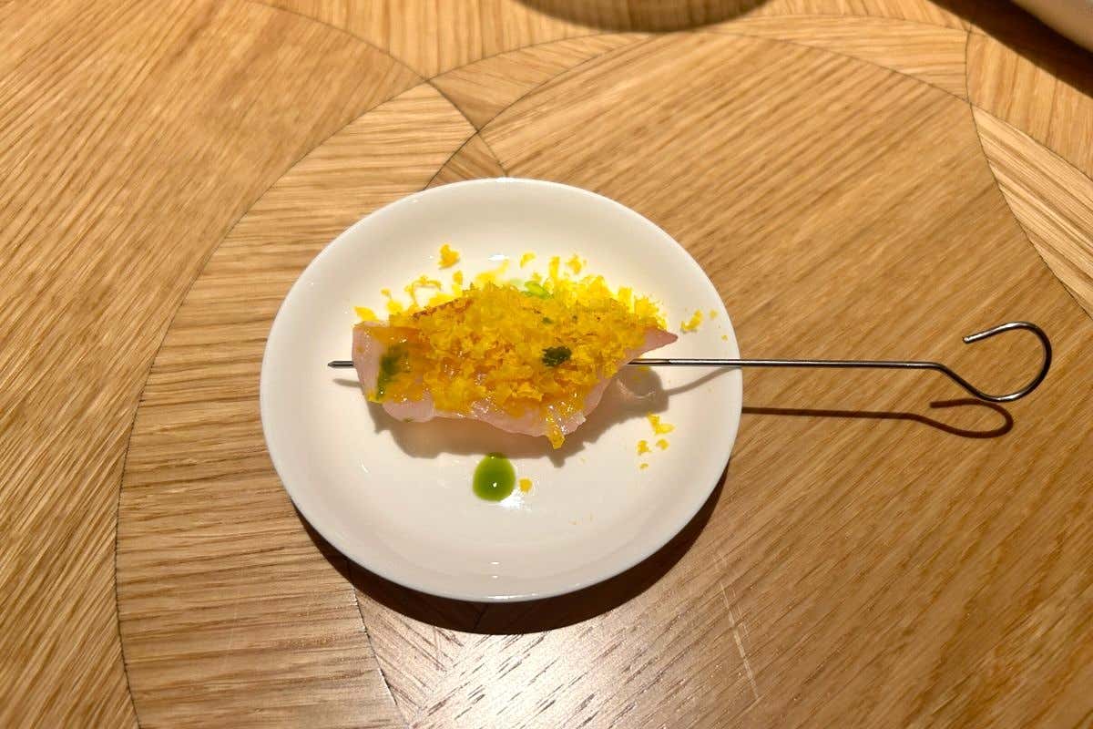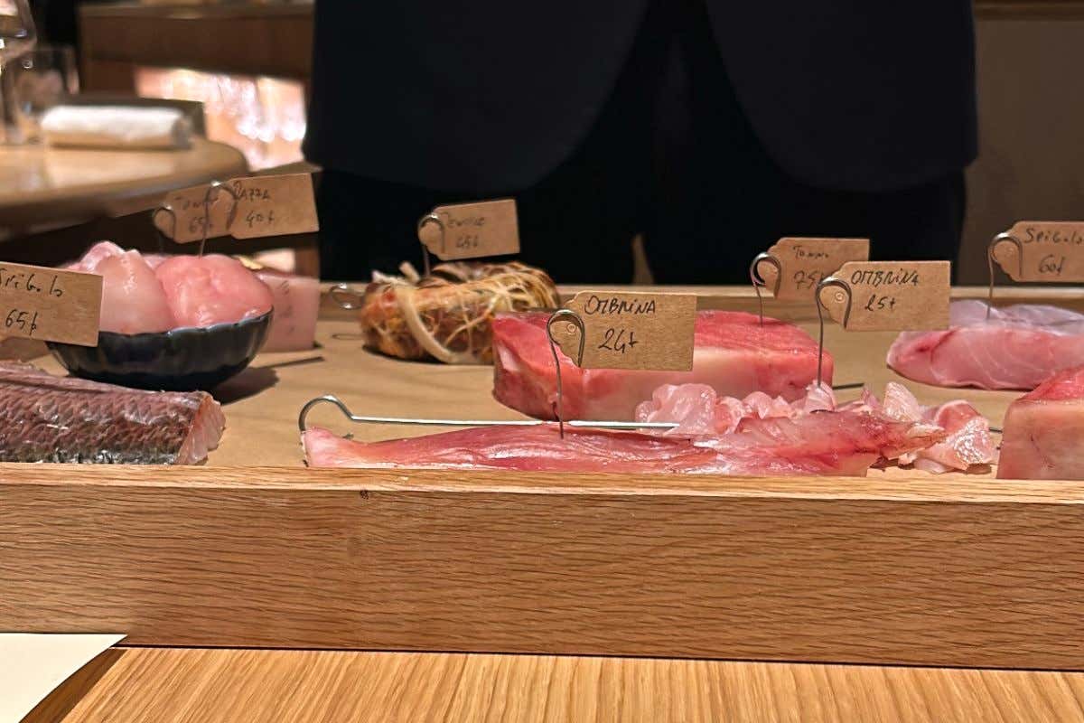 Si inizia dai crudi fino ad arrivare al pesce cotto alla brace (grande il camino in cucina, tutto a vista). Il benvenuto è affidato a una ricciola con tuorlo d’uovo affumicato e grattato. La consistenza del pesce è un burro; un morso, tanto basta per rimanere già impressionati. Si prosegue con il ricco antipasto, sistemato a centro tavola in condivisione con gli altri commensali, che si sviluppa ancora sulle onde del pesce crudo nobilitato da azzeccati tocchi aromatici. Ecco che la spigola è accompagnata dalla fava tonka, la cernia assume toni agrumati grazie al pompelmo e il finger lime, l’ombrina praticamente al naturale si sapidifica grazie alla presenza di deliziose mazzancolle e alghe. Davvero gradevoli i fasolari con cachi e enula di mare, originale e sorprendente più per concetto che al palato una terrina composta da pelli miste di pesce.