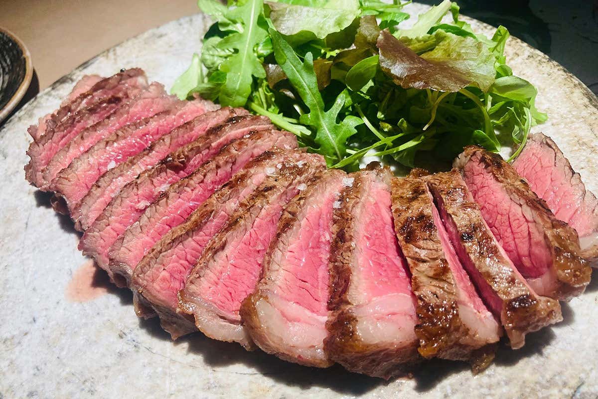 Secondo piatto scelto: Picanha Limousine, servita in tagliata con insalata e sale grosso, accompagnata dal Villa Santo Spirito Etna Rosso 2022, corpo piacevole e tannino equilibrato.