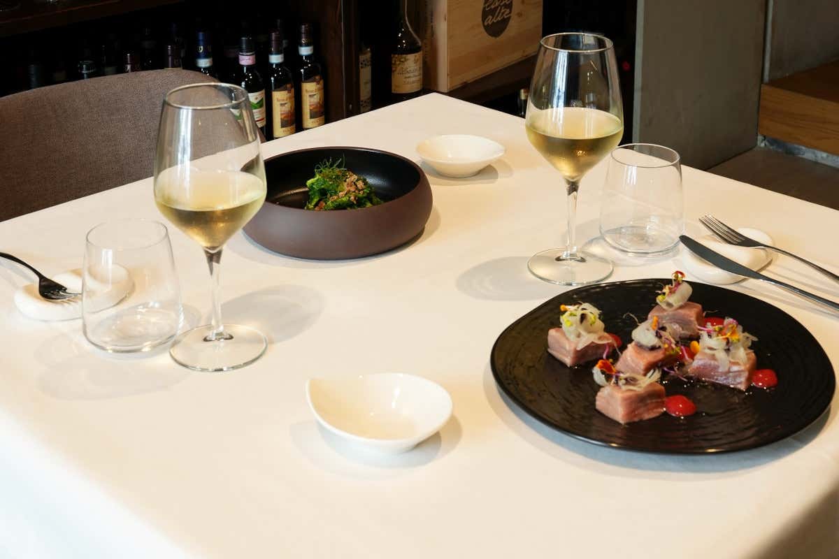 I primi piatti sono accompagnati da Etna Bianco Superiore Lindo 2023 da uve Carricante. Nel menu di pesce, Dudu, tonno fritto con maionese, capperi, fondo di vitello e germogli di barbabietola.