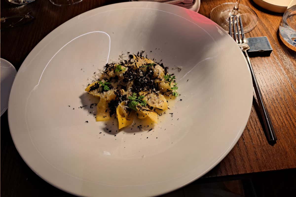 Cappelletti: cappelletti fatti a mano con tartufo nero pregiato, Parmigiano Reggiano Vacche Rosse 24 mesi. Tagliata: taglio di manzo, Aceto Balsamico Tradizionale, Parmigiano Reggiano Vacche Rosse, rucola e pomodorini. Capesante e Mazzancolle: con fondente di patate, shitake, puntarelle, fondo di cipolla. Piccola pasticceria: bombe di passion fruit e pepe rosa, brownies con caramello, kiwi rosso. Perché quando la frutta è buona diventa un ottimo dessert.
