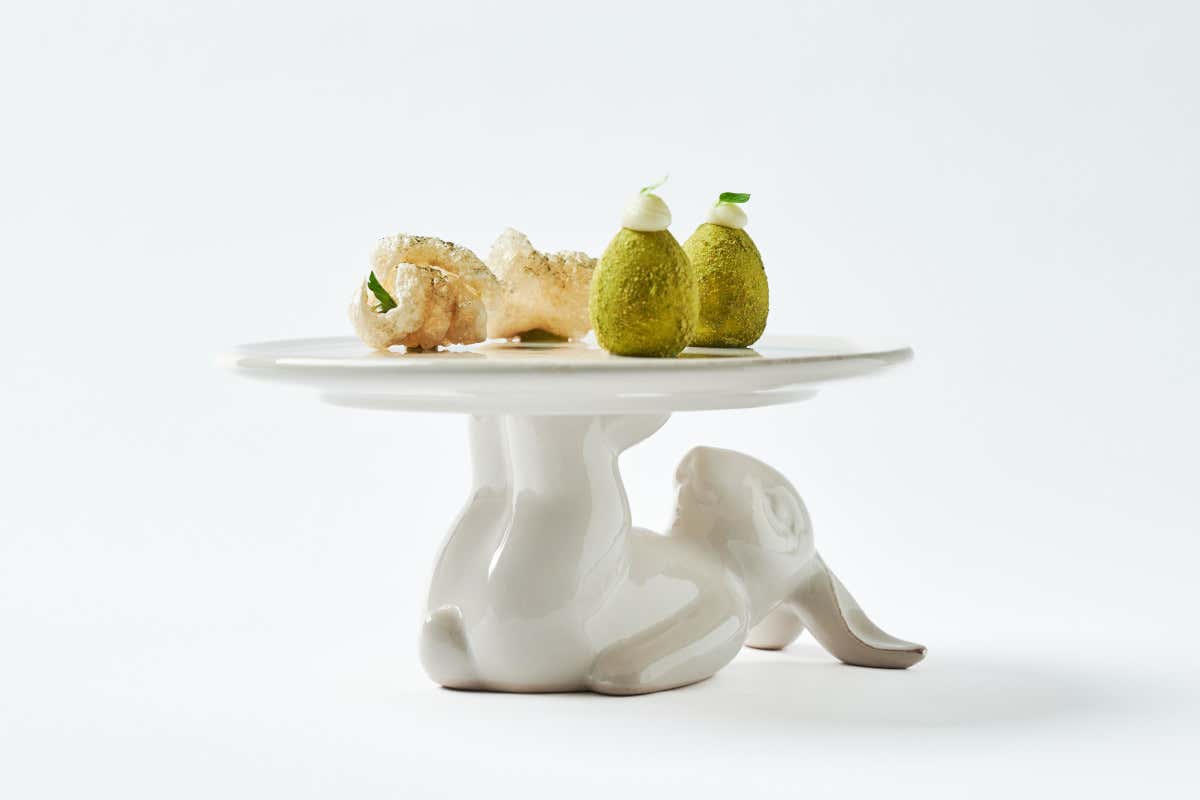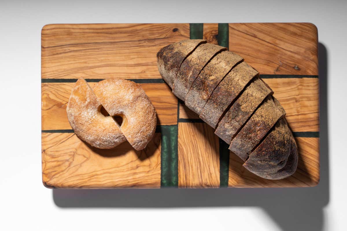 Si inizia quindi con una squisita cotenna di maiale soffiata, crema di bruscandoli (i germogli del luppolo selvatico), riduzione di birra e polvere di carletti. Delicato e suadente è l'ovetto di quaglia bollito con cuore all'aglio nero, avvolto da una polvere di asparago verde e una crema di formaggio marzolino del caseificio Caccialupi. Goloso il capitolo dei pani, ottenuti da farine locali, con una focaccina morbida cui vengono aggiunti di semola e olio d'oliva novello delle tenute dello chef, ovvero la "scanata" e una pagnotta rustica morbida al suo interno e con la crosta croccante.