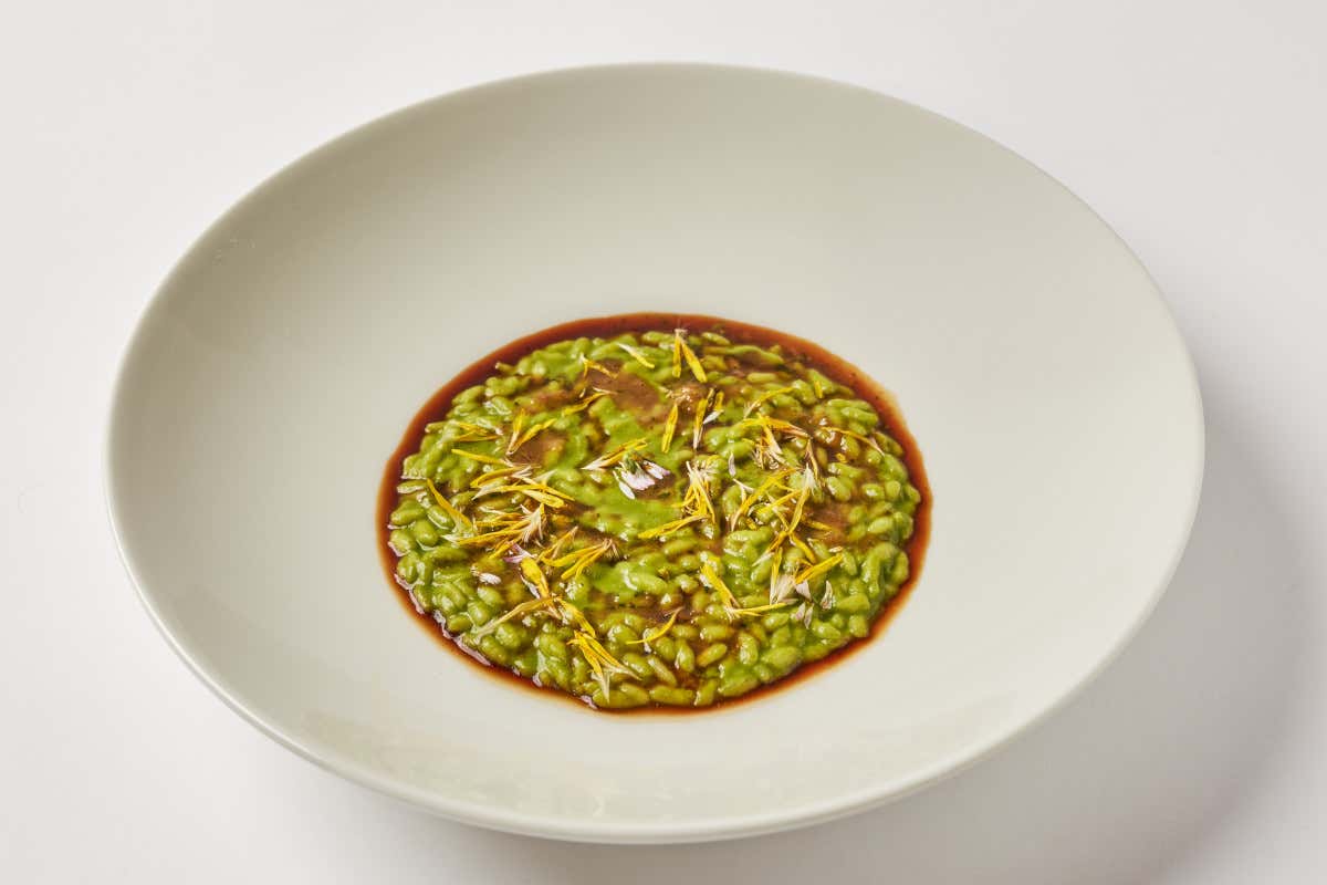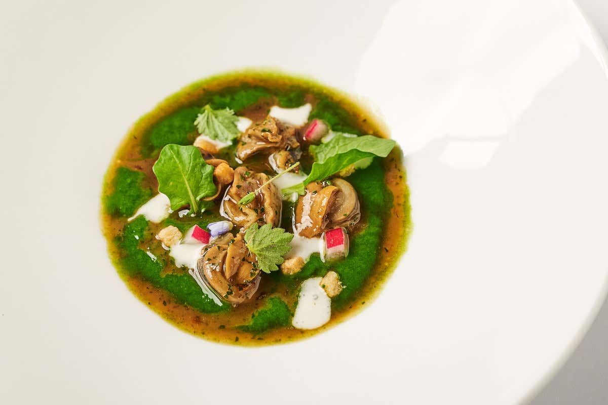 Bernardo Tavola Temporanea: crema di aglio orsino con lumache, beurre blanc, lardo croccante e ravanelli crudi