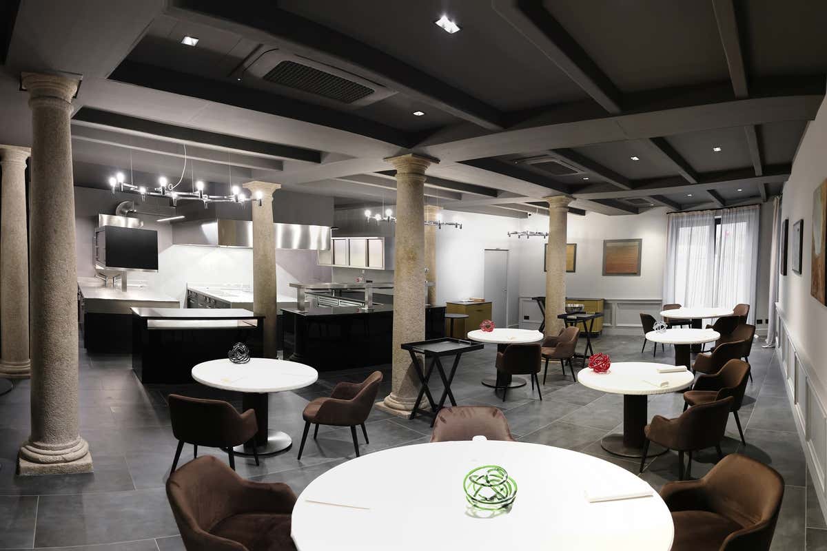 Al centro della sala troneggia una cucina a vista in lucida tonalità nera, che diventa un palcoscenico che invita gli ospiti a immergersi nel fascino del processo creativo. Intorno, i tavoli sono disposti con cura tra antiche colonne, creando un’atmosfera intima e sofisticata dove ogni dettaglio parla di eleganza essenziale.