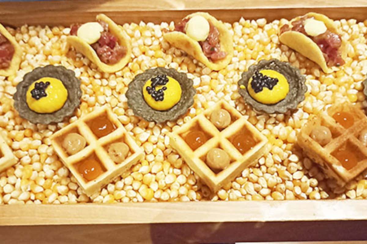 Come benvenuto Stefano Rossi (sous chef Matteo Trinti) ha aperto le danze con gli sfiziosi "amuse bouche" della casa: una tartelletta alla gardesana con capperi e limone del Garda; l'uovo di montagna dell'azienda di Mattia Cristoforetti e Giovanni Tava proposto con spuma al prezzemolo e farro soffiato; i tacos di barbabietola con crema di caprimo ed erba cipollina. Un piacevole divertissement per preparare il palato alle portate principali da accompagnare con l'accattivante cesto del pane (di segale, farro e noci), i grissini alla farina di polenta e le sfoglie croccanti con polvere di capperi insaporite con il burro montato e l'olio extravergine bio del Garda trentino.