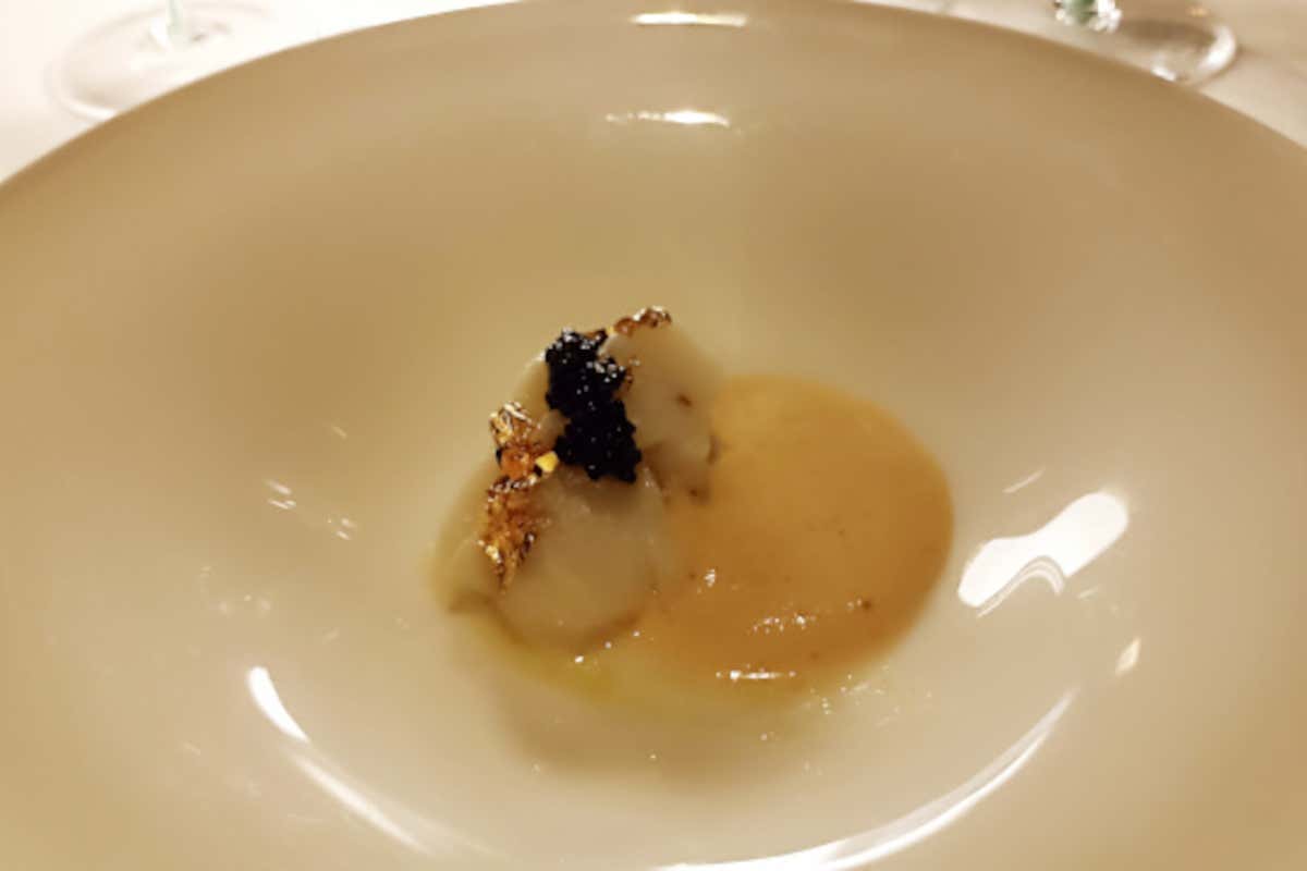 Stefano Rossi ha reinterpretato la ricetta classica del baccalà con l'estro creativo dei grandi chef e un tocco di modernità: il trancio di stoccafisso è stato impreziosito con il caviale Calvisius, una fogliolina d'oro e una soffice spuma di polenta. Piatto squisito accompagnato dallo Chardonnay dell'azienda Comai di Riva del Garda, un vino dal bouquet fruttato e floreale, con piacevoli note che richiamano la pietra focaia. Nasce sui pendii terrazzati di Tenno che si specchiano sul versante trentino del Lago di Garda.
