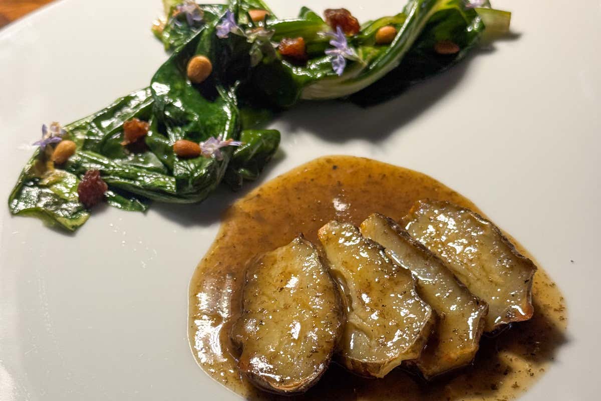 Ogni alimento ha il suo tempo. L'aceto ha bisogno di oltre un anno per partire; troppo freddo, all'inizio. Ma una volta attivato, resta vivo. Ne esistono versioni aromatizzate con succo di more, altre con fragole. L'origine è familiare: la madre di aceto usata oggi ha 51 anni. La stagionatura del riso Carnaroli è un altro tassello. Dopo tre mesi in grotta, il chicco perde amido, guadagna idratazione, riduce i tempi di cottura e sviluppa aromi più simili a quelli del riso integrale. Anche in questo caso, nessuna fissa ideologica. Funghi e ortaggi completano il quadro. I primi (cardoncelli, shiitake, finferli) crescono bene per via dell'umidità e della scarsa luce. I secondi, cavolfiore, finocchio, topinambur, radicchio, broccoletti selvatici, vengono messi da parte nei momenti di abbondanza, conservati e recuperati quando servono. Non c'è spreco, ma nemmeno feticismo della sostenibilità, c'è solo intelligenza nel gestire le microforniture di piccoli orti con pochi clienti.