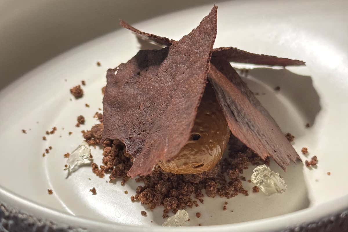 Il menu “Evoluzione in grotta” è il più diretto. Cinque portate che attraversano ciò che la grotta ha prodotto: stracchino stagionato in grotta, limone candito, riso maturato, cioccolato affinato. Alcune di queste voci ritornano nel dessert “Sospiro a Frascati”, un piatto costruito sui quattro cioccolati, ciascuno riferito a un'era geologica e a un tipo di roccia: rame, calcio, lava puzzolana, peperino. Il nome richiama un'abitudine quotidiana, il sospiro bevuto al bar con il vino della casa, un gesto che qui diventa materia di studio, variazione tecnica, stratificazione gustativa.