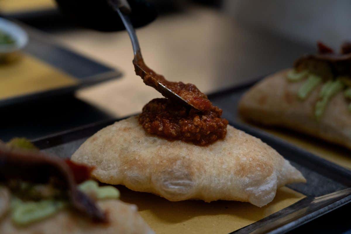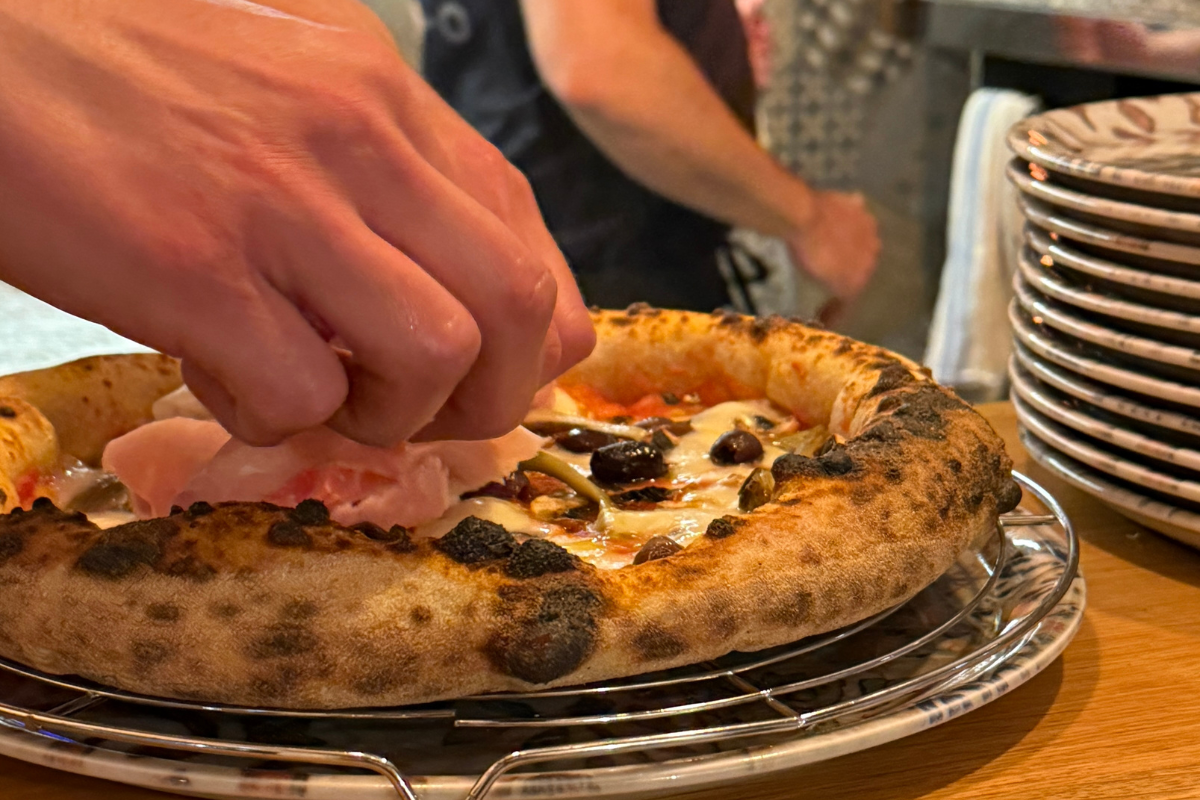 Oggi a “La Villa” si usa un solo impasto, studiato e bilanciato nel tempo, che matura per 3 giorni. Un mix di farina 1, 0 e integrale, capace di donare struttura, colore e profumo. «Volevo un impasto che si sentisse, anche all’olfatto. Quando metti il naso sul bordo e senti quel sentore di cereale, capisci che è vivo». Idratazione? «Stiamo su un 72-75%, ci lavoriamo bene. Si cuoce bene, è scioglievole ma non umido».