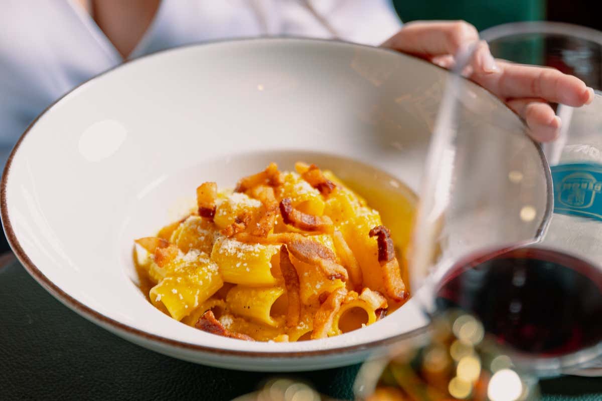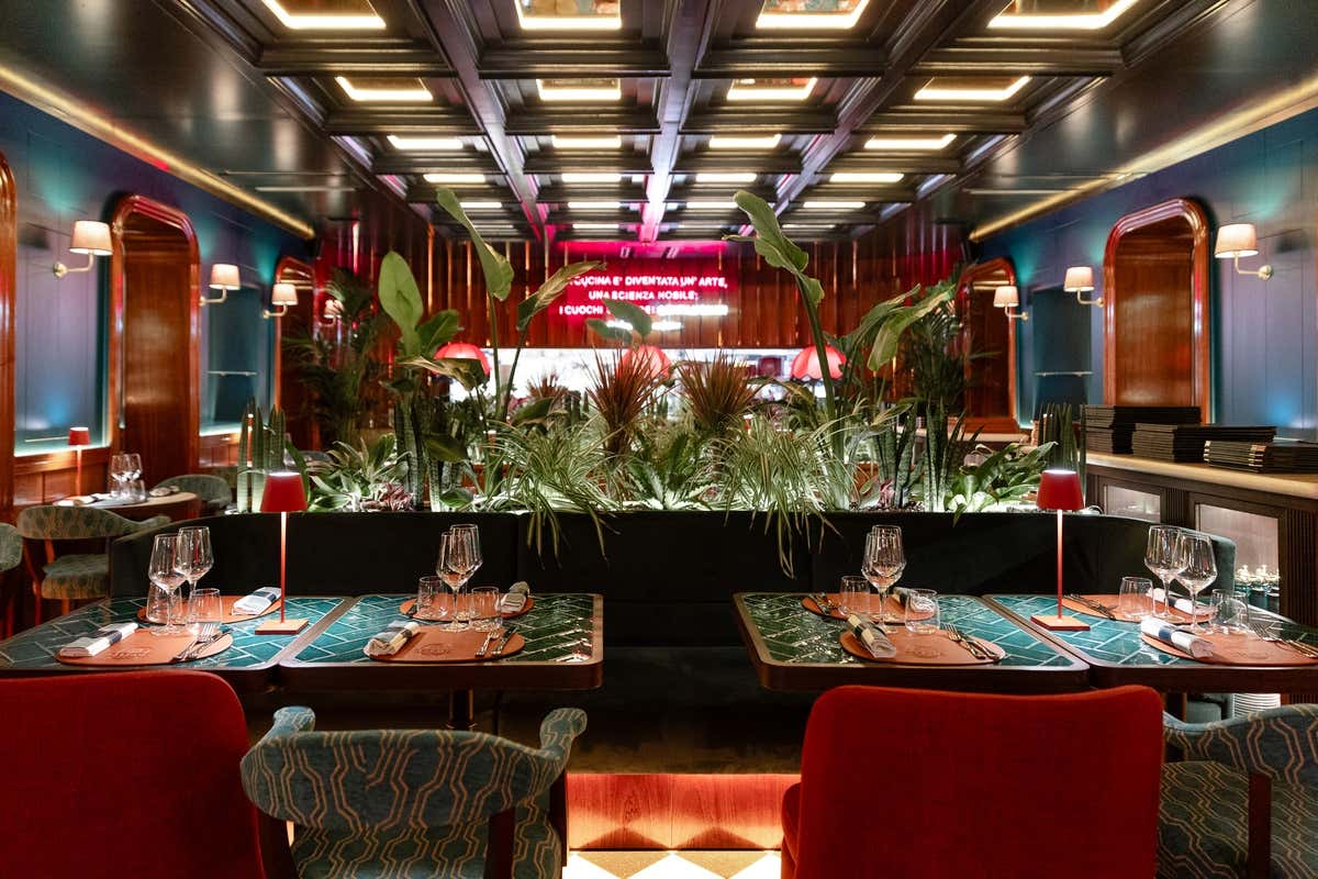 380 metri quadri di atmosfera elegante e rilassata, 120 coperti e un salotto avvolgente che profuma di legno lucido, graniglia e dettagli studiati con precisione quasi sartoriale. Campilongo, grande appassionato di design, ha scelto personalmente una tonalità di verde scuro che contrasta con la pelle e i tessuti rossi, evocando i ristoranti di Manhattan ma con un’anima tutta italiana. Le luci led, le piante verdi, i richiami all’arte: tutto è pensato per offrire un senso di lusso rassicurante, mai ostentato. Un'estetica in equilibrio perfetto con la sostanza.