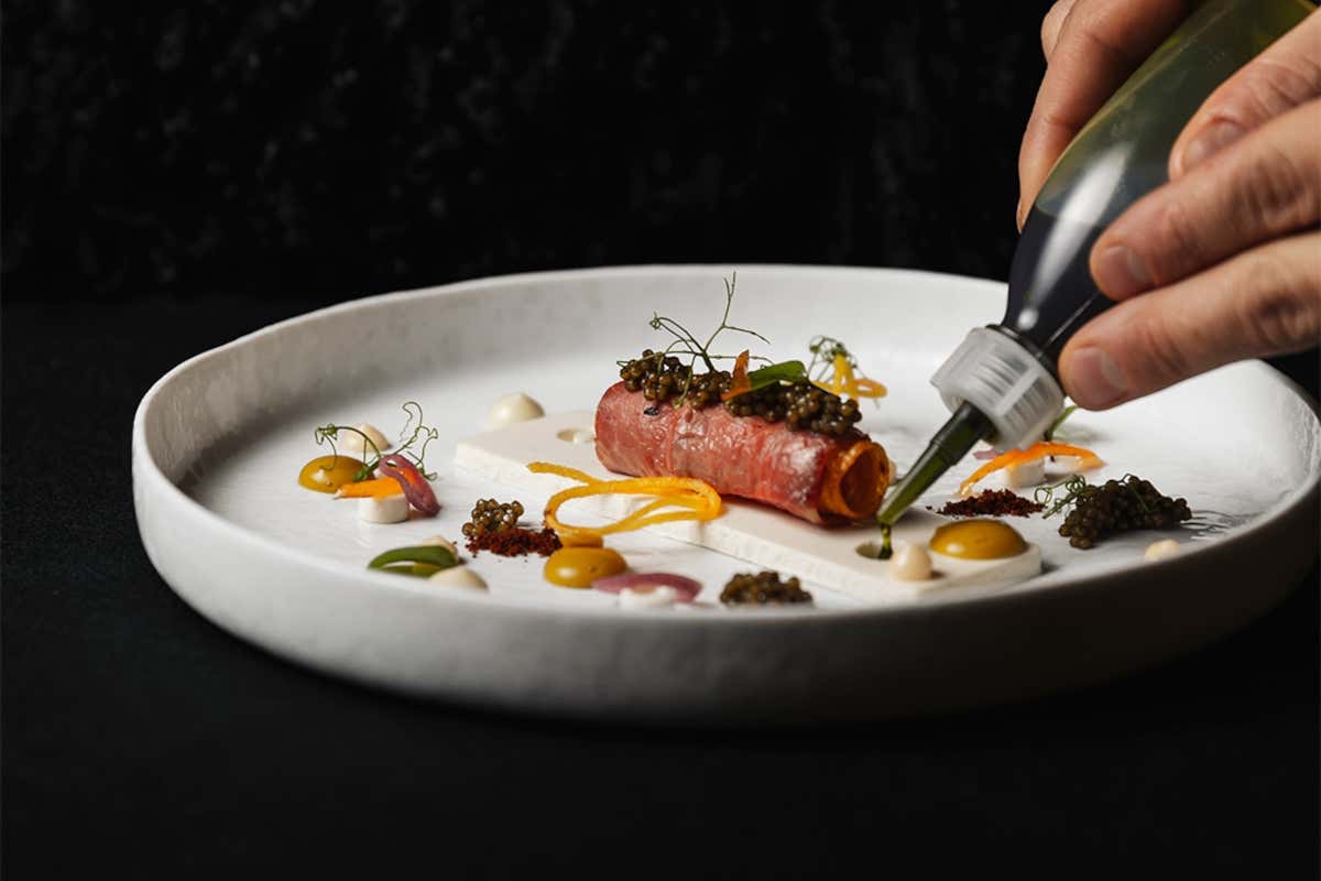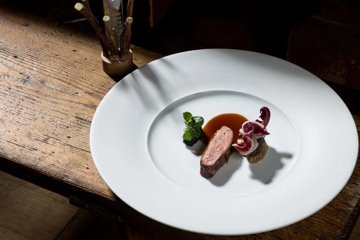L'allevamento di pecore è gestito direttamente dalla struttura. Lo stile culinario è moderno, con influenze giapponesi ben dosate. Tra le proposte del menu a sei portate: gambero alpino con katsuobushi, bisque di pomodoro e yuzu, oppure pesce gatto tirolese con fave.