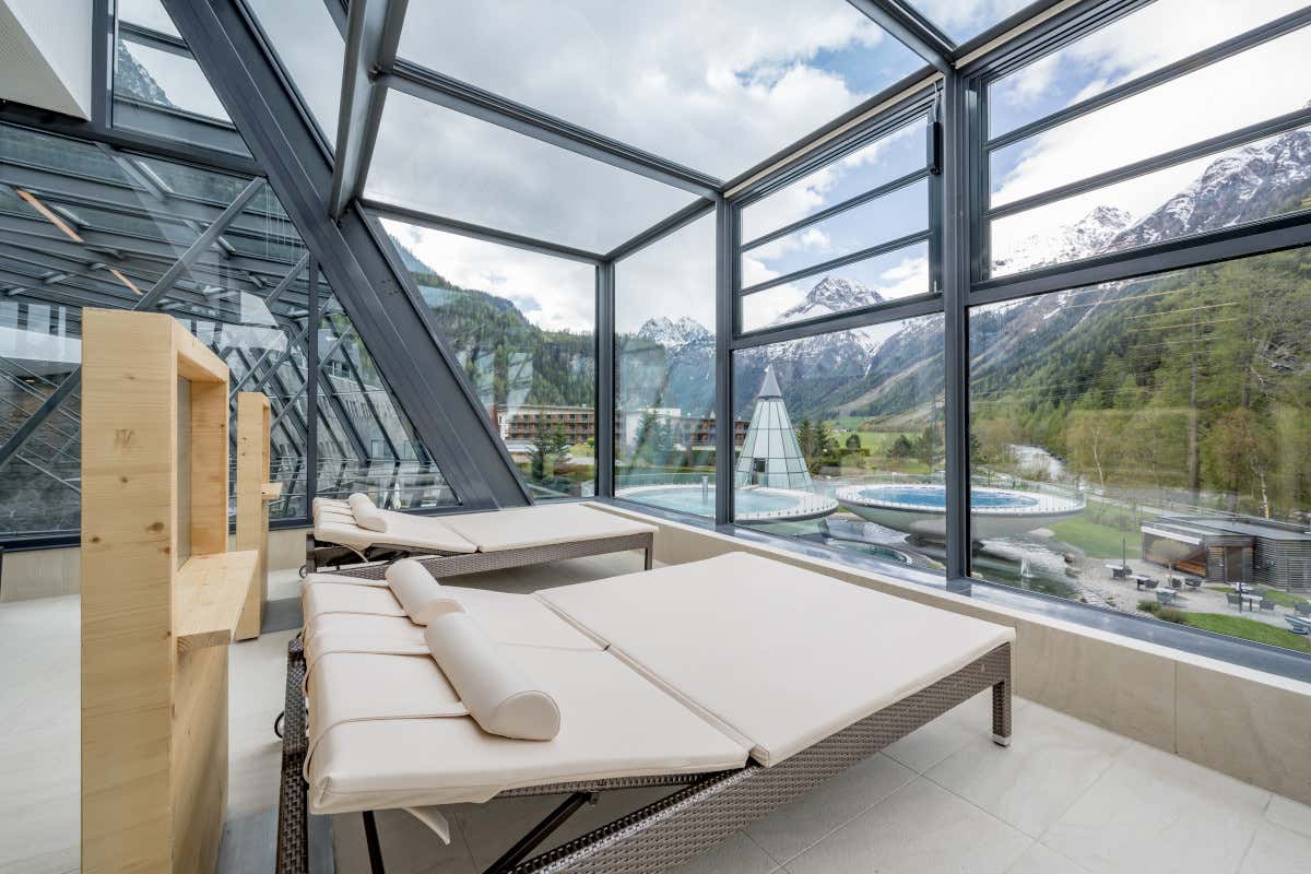 Il primo vero contatto è avvenuto con Aqua Dome di Längenfeld, che rappresenta l'equilibrio perfetto tra avventura e relax. Le vasche esterne galleggiano letteralmente nell'aria, offrendo ai bagnanti un'esperienza che oscilla tra il surreale e il sublime: immersi nell'acqua termale a 36 gradi, lo sguardo spazia sulle vette che toccano i tremila metri, mentre il corpo si abbandona alla carezza di acque che risalgono dalle profondità della terra, precisamente da 1865 metri sotto la superficie.