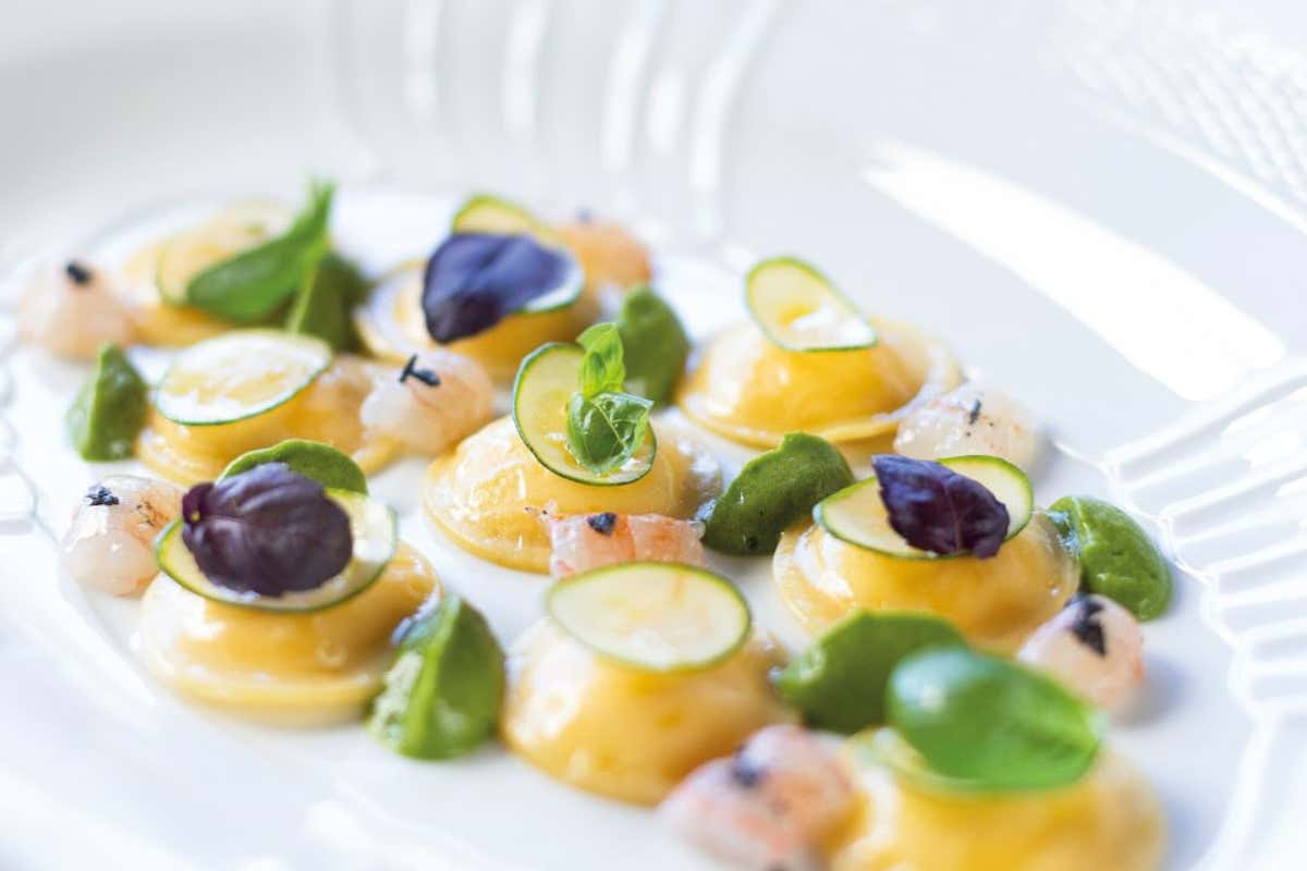 Capriccio: Bottoni ripieni di salsa olandese, zucchine e scampi