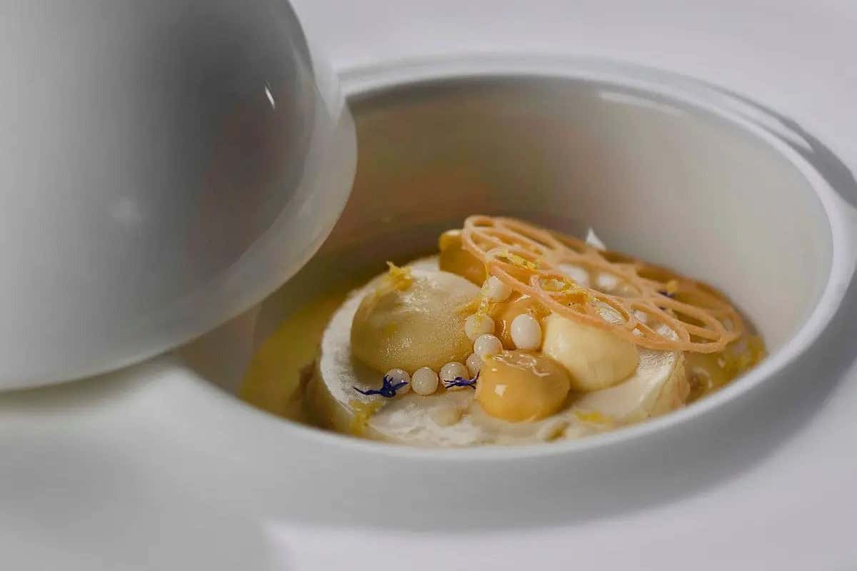 Coda di Rospo alla Mugnaia con insalatina di carciofi, pecorino e bottarga. Elegante connubio tra la delicatezza del pesce e la vivacità degli ingredienti che lo accompagnano. La coda di rospo, dalla carne soda e saporita, viene cotta con la classica preparazione "alla mugnaia": una salsa al burro nocciola, limone e prezzemolo che ne esalta la freschezza. L'insalatina di carciofi aggiunge una nota croccante e leggermente amarognola, il pecorino apporta una piacevole sapidità e la bottarga, con il suo intenso sapore di mare, completa il piatto con eleganza. È un equilibrio di consistenze e sapori rassicuranti. Conclude questo viaggio siderale, la Torta di mele con crema inglese al limone, un classico intramontabile, semplice, centrato, il gusto che non provoca scossoni ma ti radica nel tempo.