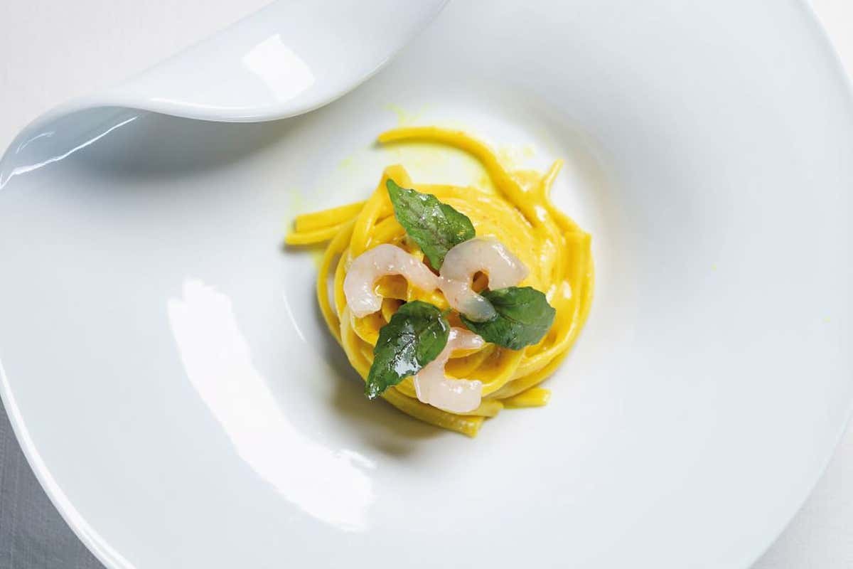Capriccio: Tagliolini risottati alla curcuma, leche de tigre, gamberi rosa e bottarga