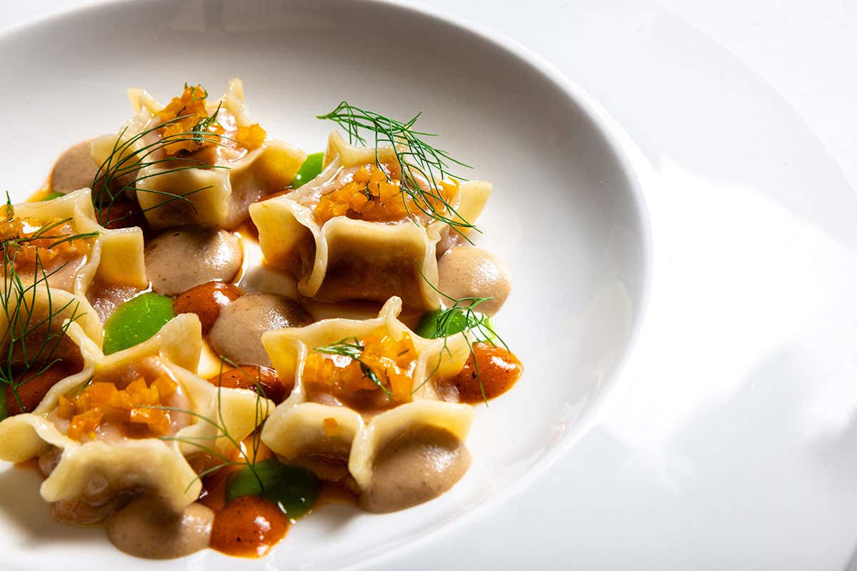 Il classico ortaggio 'mbuttunato, cioè imbottito, subisce una mutazione diventando raviolo confezionato a fiore mentre la Melanzana 2022 si evolve con una raffinata glassatura con tapenade di olive di ispirazione provenzale, circondata da chips di origano, sorbetto di pomodoro e salsa di basilico.