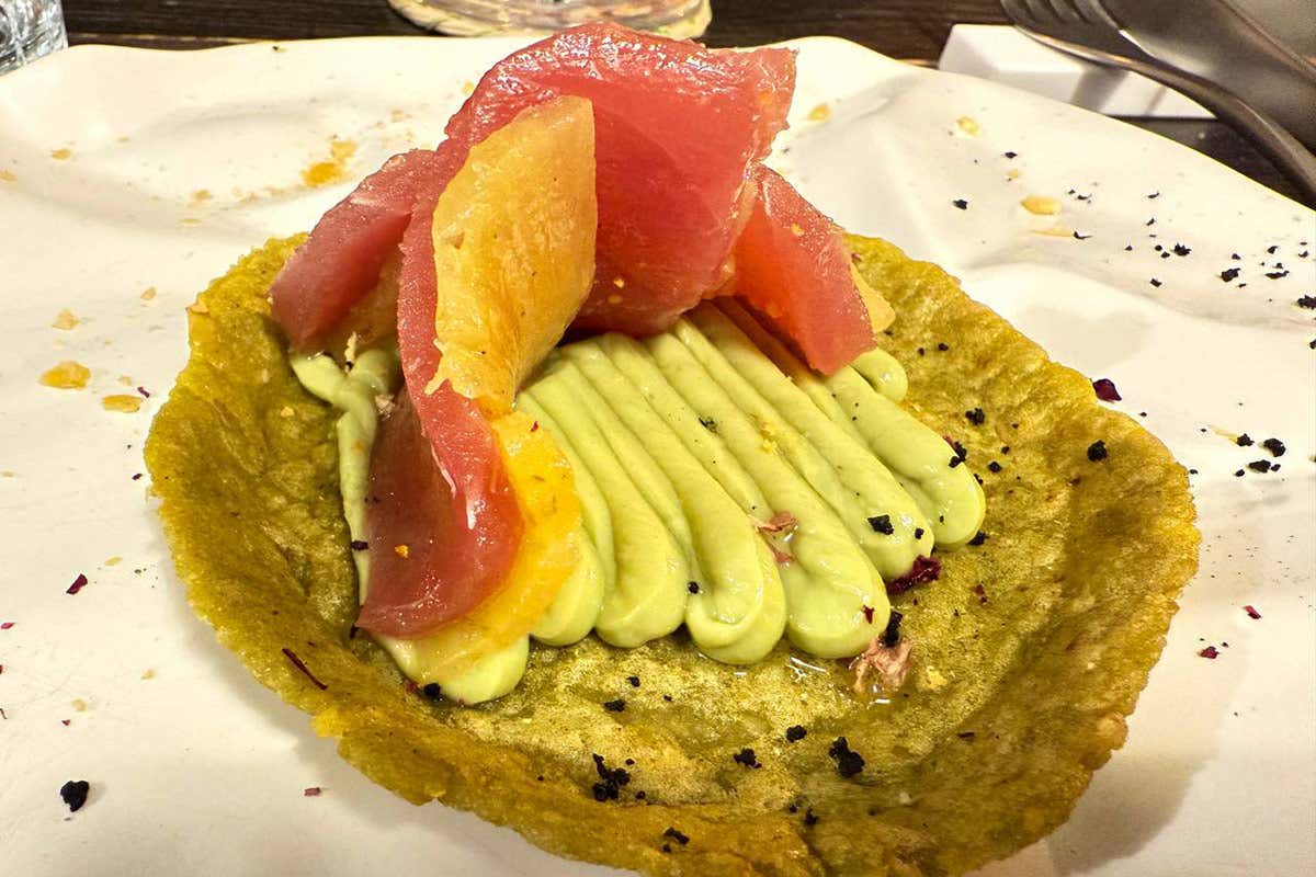 Il gambero rosso di Mazara si tuffa nella leche de tigre aromatizzata con mela e yuzu, mentre il wagyu giapponese trova posto accanto a tacos con ribeye irlandese e formaggio affumicato. Così si potrebbero descrivere i piatti che in realtà andrebbero visti e gustati, senza spiegazioni anticipate, per non rovinare il piacere di scoperte sempe nuove. E così troviamo memelas al plancton, ceviche di ricciola, waffle di pandebono con tartare di black angus, nocciole e pere fermentate: piatti che raccontano un mondo senza bandiere, ma con una forte coerenza stilistica. In ogni boccone si avverte la mano di una cuoca che conosce il valore della contaminazione, ma sa restare fedele alla propria visione. Il tutto grazie ad un felice accompagnamento di miscelati o vini proposti con attenzione da Roberto Mantiero.