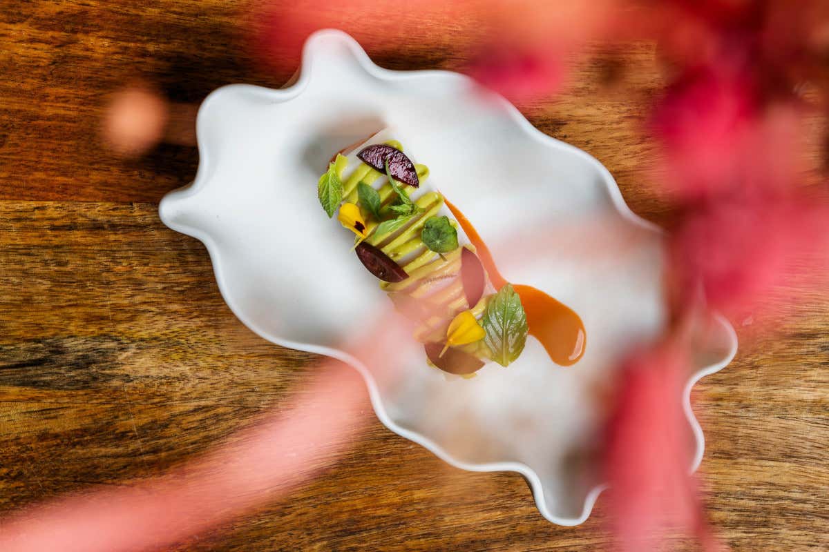 Così è divertente iniziare con la cassettina del Pic Nic, comune ai due percorsi di degustazione Identità (110 euro, 7 portate) ed Evoluzione (95 euro, 6 portate) ispirata al contesto bucolico del luogo, dalla quale vengono estratti una serie di deliziosi amuse-bouche, tra i quali la stuzzicante pelle di pollo croccante con pâté di fegatini e la saporita crème caramel con miso e salsa di soia. Proseguendo con Identità, che abbiamo scelto, arriva il notevole "Cannolo di mare" con gamberi di Oneglia, ciliegie, seppia, avocado e crema di mandorla. Non da meno l'aragostella, servita con pesche tabacchiere alla verbena, salsa olandese e popcorn di amaranto. La croccante focaccia del contadino, da abbinare al 'gianduiotto' di burro montato alla nocciola, traduce in puro godimento l'abilità dello chef con i lievitati.