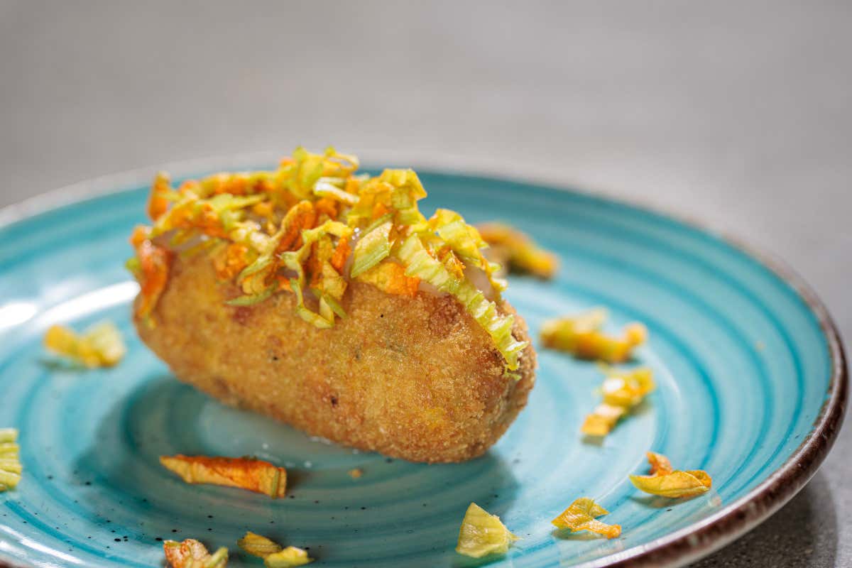 Originale, molto buono, il Polpo ladro, polpetta di polpo panata con patate speziate, Parmigiano Reggiano 36 mesi, prezzemolo fresco, pepe nero e maionese all’Asprinio d’Aversa.