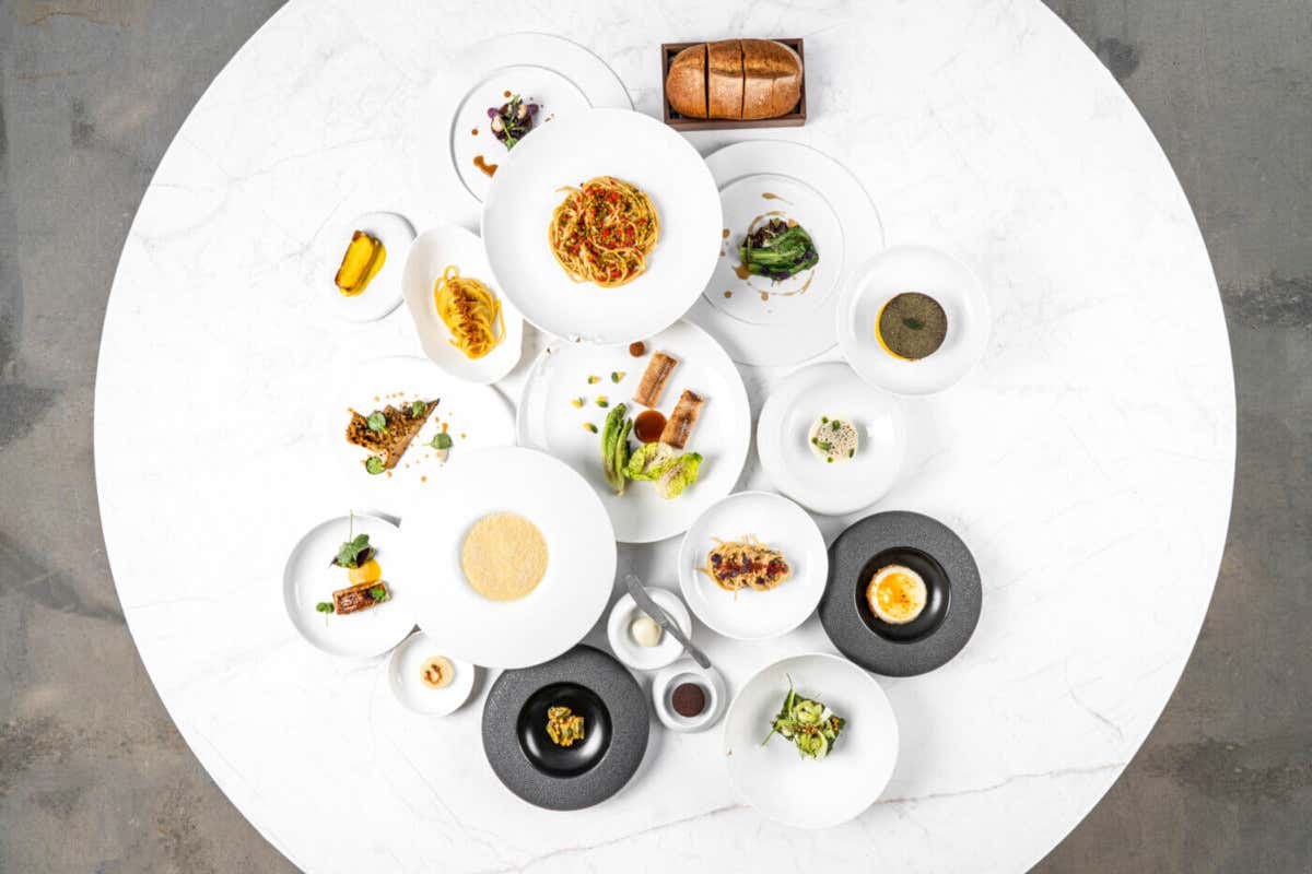 L’impronta gastronomica si è evoluta, ma sempre dentro un quadro coerente. Il menù “Omaggio alla tradizione” tiene insieme i piatti più noti della cucina italiana, riscritti secondo criteri di pulizia e misura. Gli altri percorsi, “Vegetali, tuberi e radici” e “A modo mio”, lasciano spazio all’invenzione personale. È su questi che si misura la libertà. «A partire da una base vegetale che per me resta centrale, costruiamo piatti che raccontano un’idea molto chiara: concretezza, leggerezza, essenzialità. E questo non vale solo per me, ma per tutta la squadra».