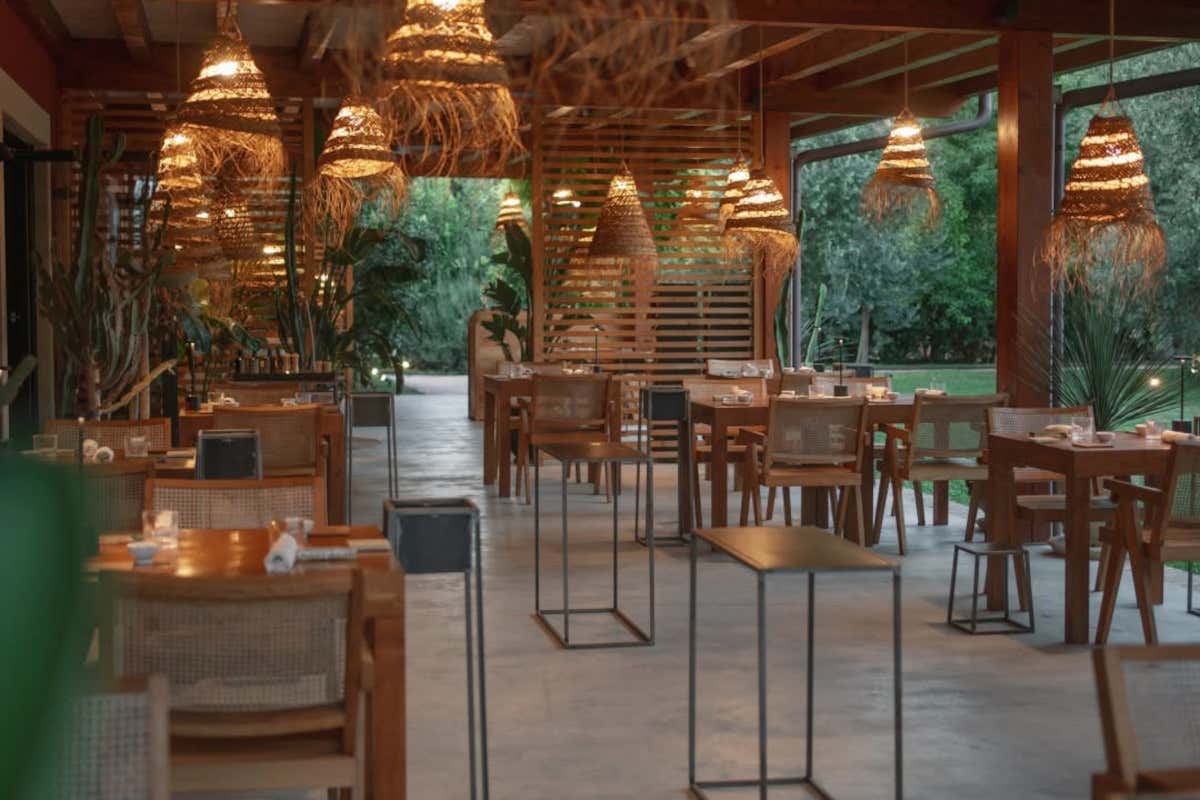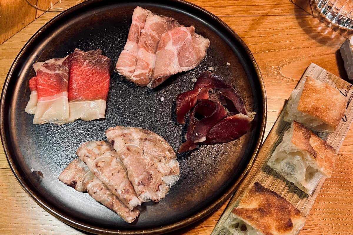 Il richiamo è anche quello della cucina del grande ristorante, interno ed esterno, con la presenza attenta e discreta di un giovane staff di sala con stretto collegamento con la cucina. Soprattutto dopo una giornata di relax a completare l'esperienza immersiva è il menu, molto dinamico per arrivi degli ortaggi al giusto punto di maturazione. Una selezione rappresentativa delle eccellenze del Lazio è infatti è sempre al centro dell'offerta e i salumi e i formaggi vengono da poco distante, da artigiani del cibo dei dintorni. Altri, come coppa, capocollo, speck d’anatra e prosciutto di picanha sono fatti incasa secondo tradizioni locali che ne affidano la stagionatura al tempo anzichè ad una forte salatura. Danno il meglio accompagnati dai pani fatti in casa.